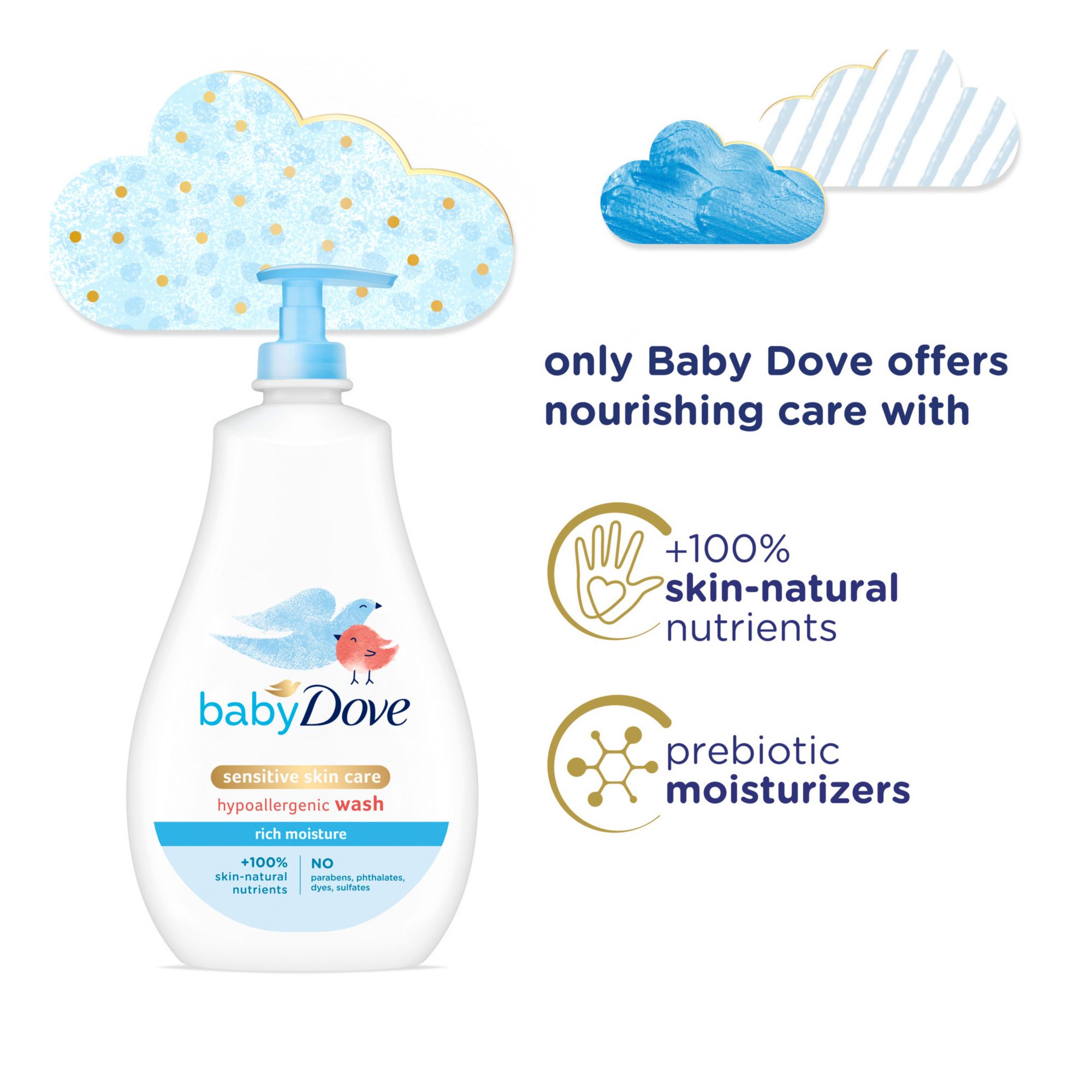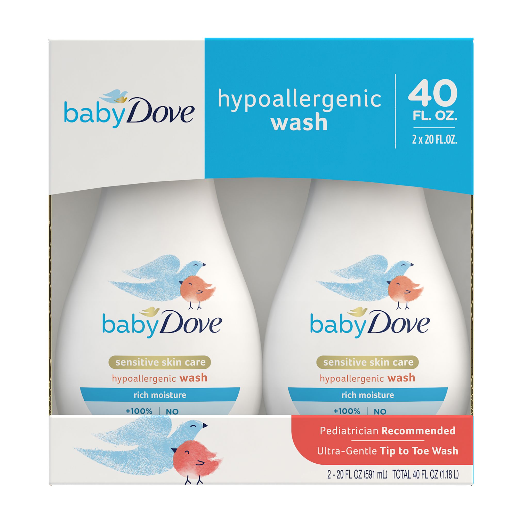 Gently nourishes and replenishes your baby's delicate skin, leaving it soft and moisturized Created without dyes, parabens, sulfates, or phthalates and ophthalmologist, dermatologist, and pediatrician tested Made with 100% skin-natural nutrients, which are nutrients identical to those naturally found in skin, and prebiotic moisture to support baby’s skin natural health The rich, creamy lather of this moisturizing baby wash leaves baby's skin feeling clean, soft, and hydrated Gentle enough for newborn’s first bath, our tear-free and hypoallergenic baby wash helps take the stress out of baby bath time Includes (2) Baby Dove Sensitive Skin Care Rich Moisture Wash, 20 oz.