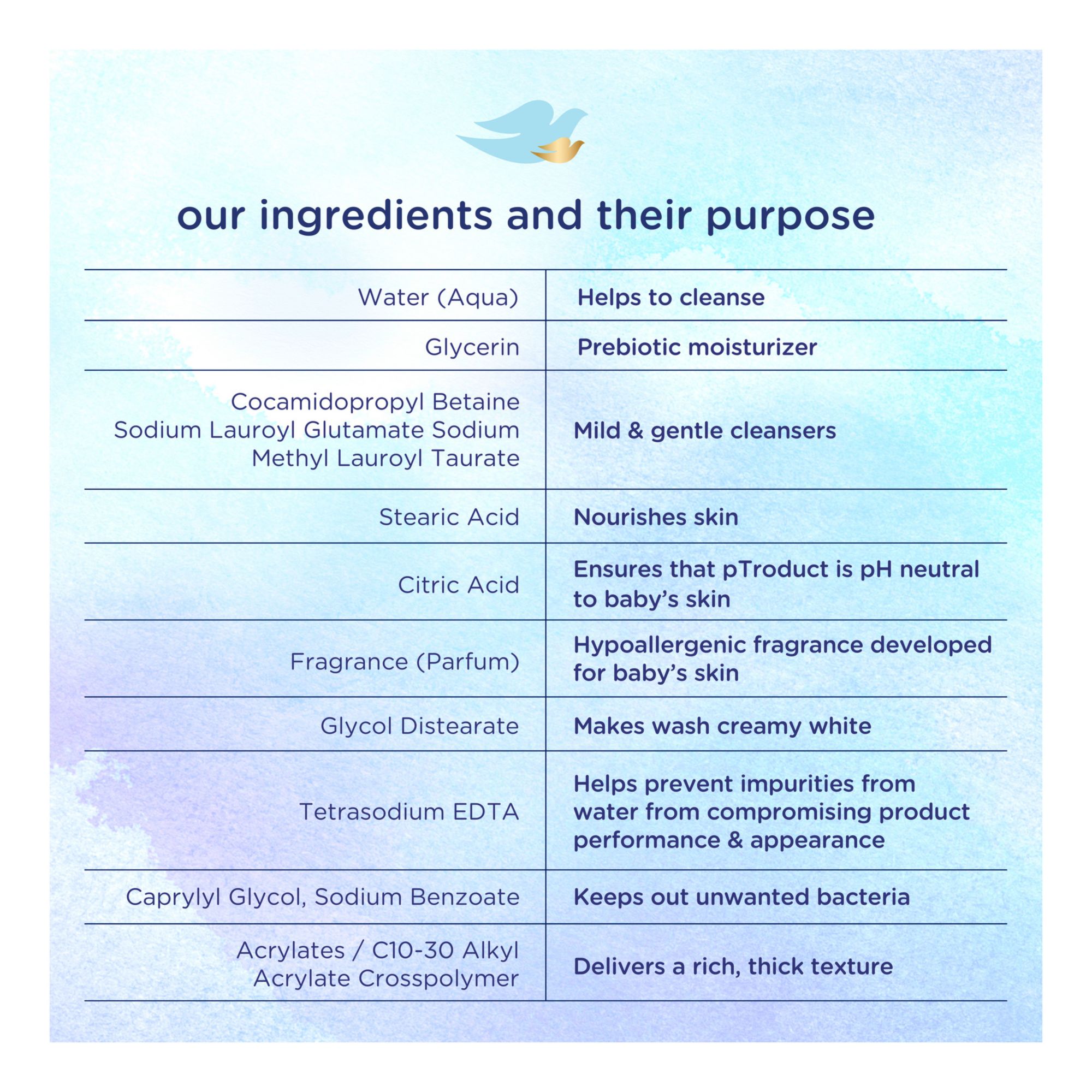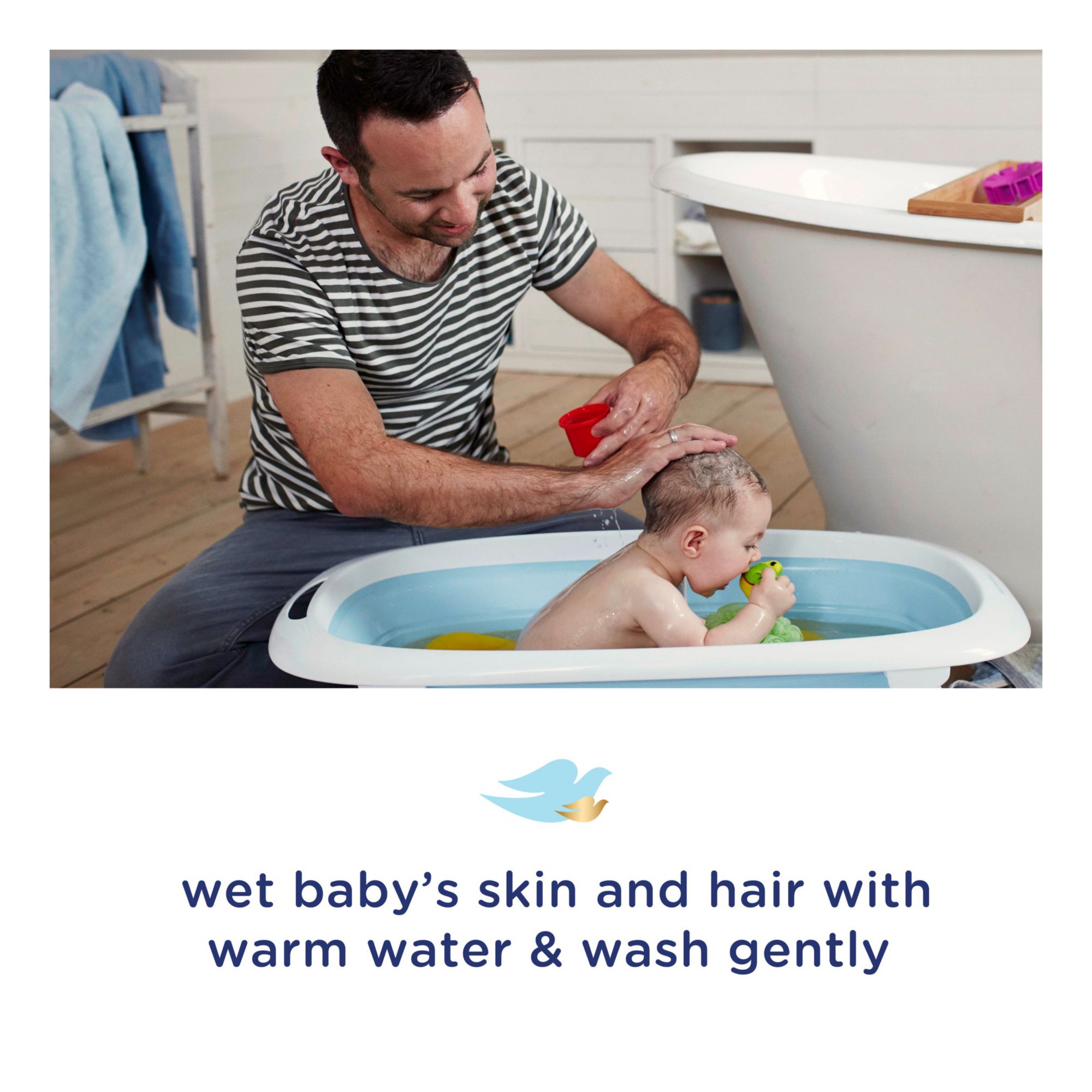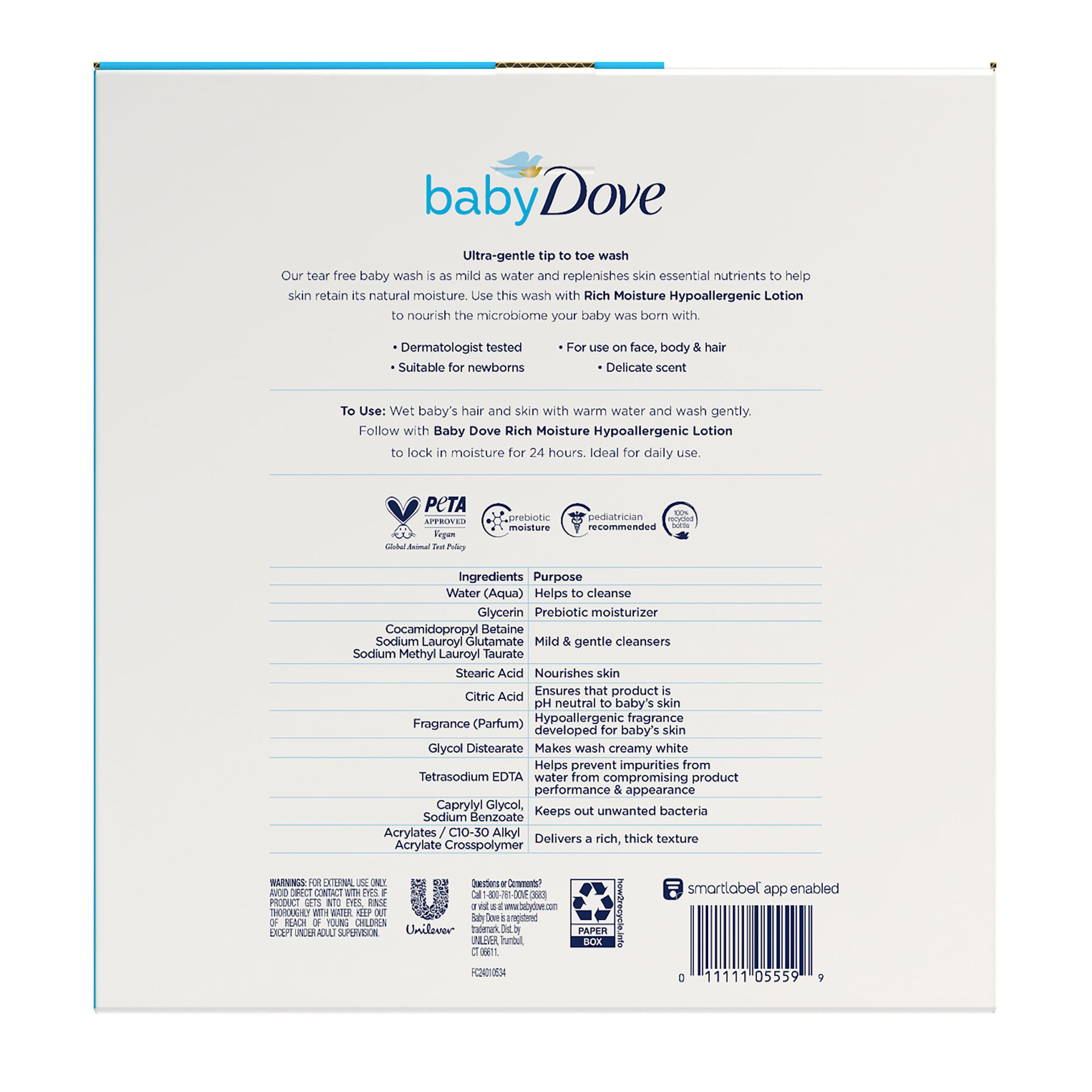Baby bath time is special. And with baby skin being 30% thinner than ours, the best care is the gentlest. To help protect your little one’s delicate skin, we created Baby Dove Rich Moisture Hypoallergenic Baby Wash to help nourish and replenish your little one’s delicate skin during bath time. This tear-free and hypoallergenic baby wash for skin and hair ensures bath time is all about smiles, not tears. Made with 100% skin-natural nutrients, which are identical to those naturally found in skin, and prebiotic moisture to help replenish the essential moisture and nutrients that baby’s skin can lose during bath time. To use this baby wash, gently wet baby’s hair and skin with warm water, work into a lather, and rinse for touchably soft skin.
