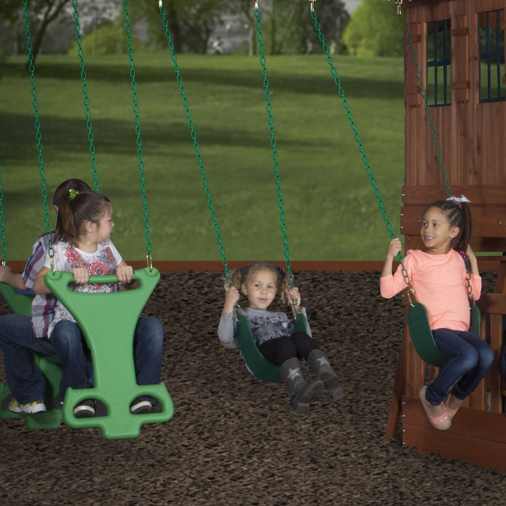 Crafted from 100% cedar wood, which is pre-cut, pre-drilled and pre-stained for simple assembly Raised clubhouse features a second-level sun porch Lower fort with a play deck and sandbox Half picnic table 10' green speedy slide 2 belt swings and 2-person glider swing Rock wall ladder Supports up to 960 lbs. or 8 children Suitable for children 3-10 years Assembly required Includes swing set, speedy slide, 2 belt swings, 2-person glider swing, rock climbing ladder and hardware Warranty: 1 year parts; 5 years on wood