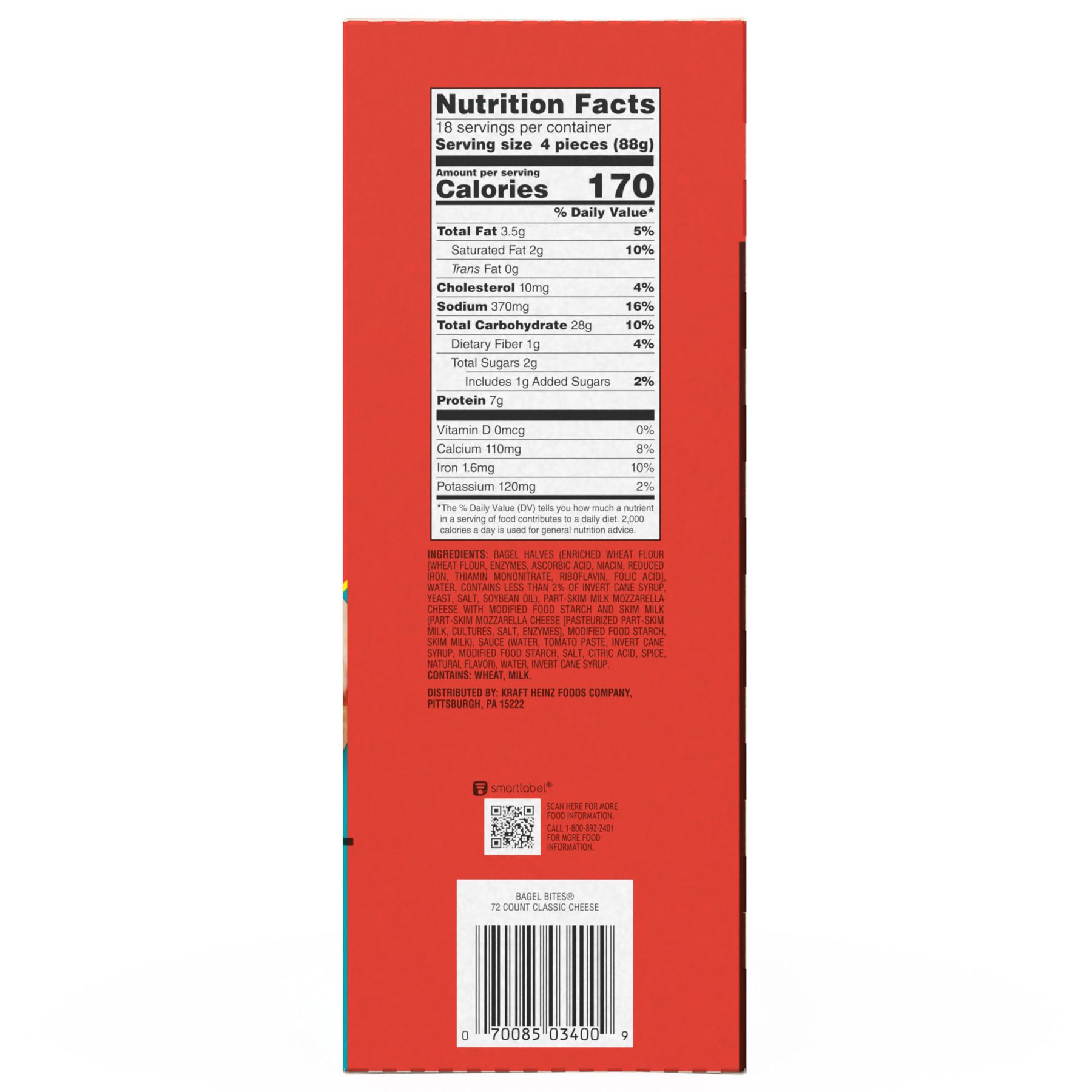 Bagel Bites Classic Cheese Mini Bagels offer a quick and easy snack that kids love and parents can easily serve. The baked mini pizza bagels are topped with a cheese blend and tomato sauce for a mouthwatering flavor that excites taste buds. Snack time is always a hit when you serve these mini pizzas at a party or as an after school snack. Bagel Bites have 7 grams of protein per serving and contain no trans fat per serving, artificial flavors or high-fructose corn syrup. Cook them in an air fryer, oven or toaster oven for a crispy finish, or microwave them for a quick snack. Each 72 count box of Bagel Bites Classic Cheese Mini Bagels includes a convenient microwavable crisping tray for easy prep. Keep frozen until ready to eat.