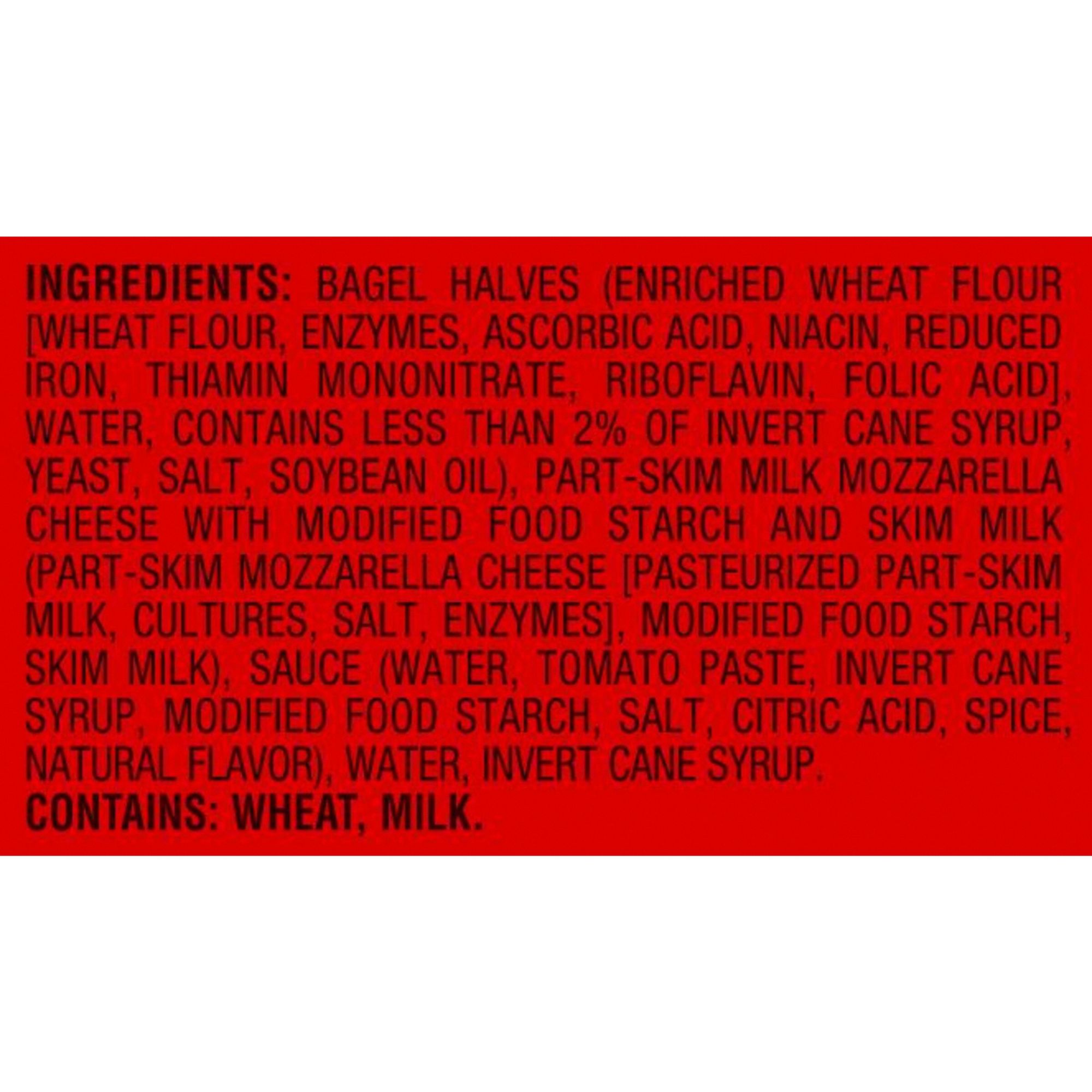 Ingredients: Bagel Halves (Enriched Flour [Wheat Flour, Enzyme, Ascorbic Acid, Niacin, Reduced Iron, Thiamine Mononitrate, Riboflavin, Folic Acid], Water, Salt, Invert Cane Syrup, Yeast, Soybean Oil), Cheese Blend (Part-Skim Mozzarella Cheese [Part-Skim Milk, Cheese Cultures, Salt, Enzymes], Modified Food Starch, Skim Milk), Sauce (Water, Tomato Paste, Invert Cane Syrup, Modified Corn Starch, Salt, Methylcellulose, Citric Acid, Potassium Chloride Ammonium Chloride, Spice, Yeast Extract, Natural Flavor, Calcium Lactate), Water, Invert Cane Syrup.