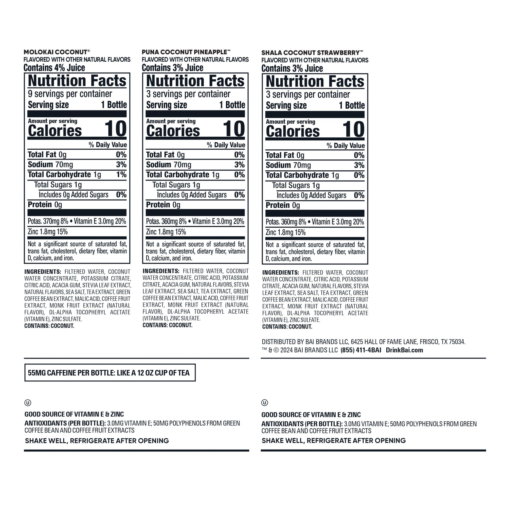 Ingredients: Molokai Coconut: Filtered Water, Coconut Water Concentrate, Potassium Citrate, Citric Acid, Acacia Gum, Stevia Leaf Extract, Natural Flavors, Sea Salt, Tea Extract, Green Coffee Bean Extract, Malic Acid, Coffee Fruit Extract, Monk Fruit Extract (Natural Flavor), Dl Alpha Tocopheryl Acetate (Vitamin E), Zinc Sulfate. Puna Coconut Pinapple: Filtered Water, Coconut Water Concentrate, Potassium Citrate, Citric Acid, Acacia Gum, Stevia Leaf Extract, Natural Flavors, Sea Salt, Tea Extract, Green Coffee Bean Extract, Malic Acid, Coffee Fruit Extract, Monk Fruit Extract (Natural Flavor), Dl Alpha Tocopheryl Acetate (Vitamin E), Zinc Sulfate. Shala Coconut Strawberry: Filtered Water, Coconut Water Concentrate, Potassium Citrate, Citric Acid, Acacia Gum, Stevia Leaf Extract, Natural Flavors, Sea Salt, Tea Extract, Green Coffee Bean Extract, Malic Acid, Coffee Fruit Extract, Monk Fruit Extract (Natural Flavor), Dl Alpha Tocopheryl Acetate (Vitamin E), Zinc Sulfate.