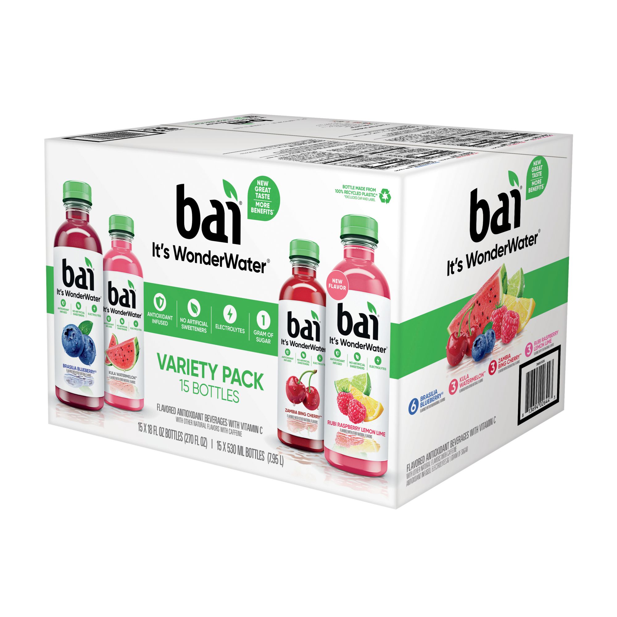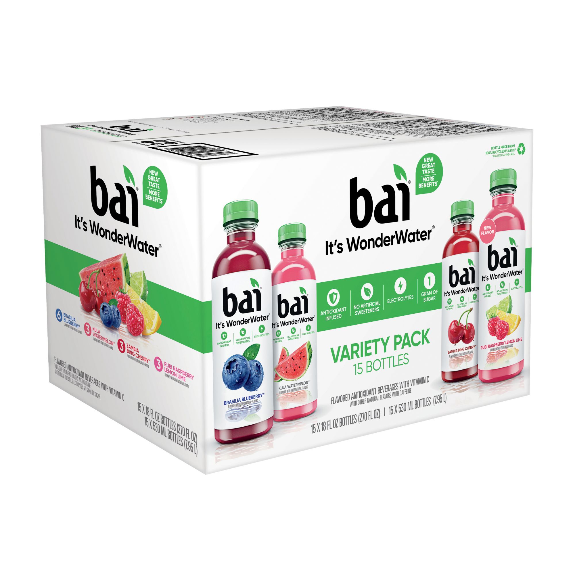 Ready for peak flavor? Grab the Bai Flavors Variety Pack, and your tastebuds will reach new heights of hydrating goodness. Inside you’ll find Bai Zambia Bing Cherry, Bai Kula Watermelon, and Bai Costa Rica Clementine and Bai Simbu Strawberry. At Bai, our water beverages deliver beyond basic hydration. Every exotic flavor is infused with antioxidants and other benefits. Not only are these fruity flavors deliciously bold and refreshing, but they have electrolytes, 1 gram of sugar, and contain no artificial sweeteners. We’ve added zinc which—in combination with Vitamin C—helps support a healthy immune system. Every hydrating sip hits a flavorful high note thanks to being sweetened with Stevia. And we’ve bottled it up in packaging made from 100% recycled plastic, excluding cap and label. Bai’s approach to innovation guides us in our quest to find new ways to translate modern wellness trends into tasty drinks everyone can enjoy. It’s a future too marvelous to exist only in our imaginations. We want everyone to experience it. Bai Flavors Variety Pack. It’s WonderWater.