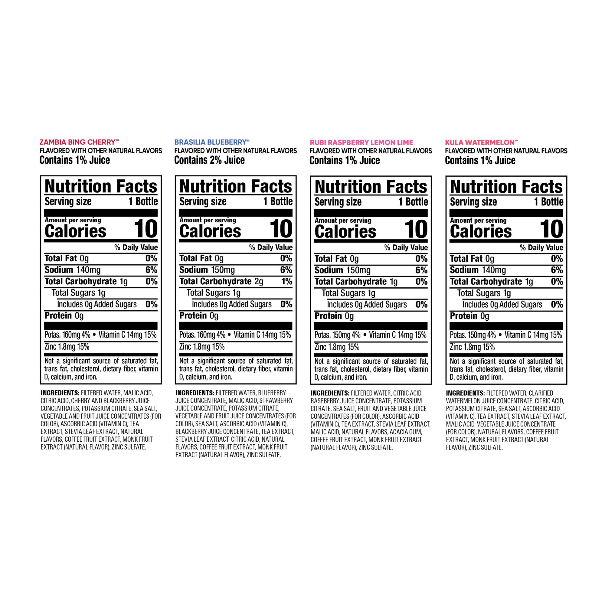 Ingredients: Costa Rica Clementine: Filtered Water, Clarified Orange Juice Concentrate, Citric Acid, Potassium Citrate, Sea Salt, Ascorbic Acid (Vitamin C), Tea Extract, Stevia Leaf Extract, Malic Acid, Natural Flavors, Coffee Fruit Extract, Vegetable Juice Concentrate (For Color), Monk Fruit Extract (Natural Flavor), Zinc Sulfate, Beta Carotene (For Color) Simbu Strawberry: Filtered water, Citric Acid, Strawberry Juice Concentrates (For Color), Potasium Citrate, Sea Salt, Ascorbic Acid (Vitamin C), Tea Extract, Stevia Leaf Extract, Natural Flavors, Malic Acid, Coffee Fruit Extract, Monk Fruit Extract (Natural Flavor), Zinc Sulfate Zambia Bing Chery: Filtered Water, Malic Acid, Citric Acid, Cherry and Blackberry Juice Concentrates, Potassium Citrate, Sea Salt, Vegetable and Fruit Juice Concnetrates (For Color), Ascorbic Acid (Vitamin C), Tea Extract, Stevia Leaf Extract, Natural Flavors, Coffee Fruit Extract, Monk Fruit Extract (Natural Flavor), Zinc Sulfate Kula Watermelon: Filtered Water, Clarified Watermelon Juice Concentrate, Citric Acid, Potassium Citrate, Sea Salt, Ascorbic Acid (Vitamin C), Tea Extract, Stevia Leaf Extract, Malic Acid, Vegetable Juice Concentrate (For Color), Natural Flavors, Coffee Fruit Extract, Monk Fruit Extract (Natural Flavor), Zinc Sulfate.