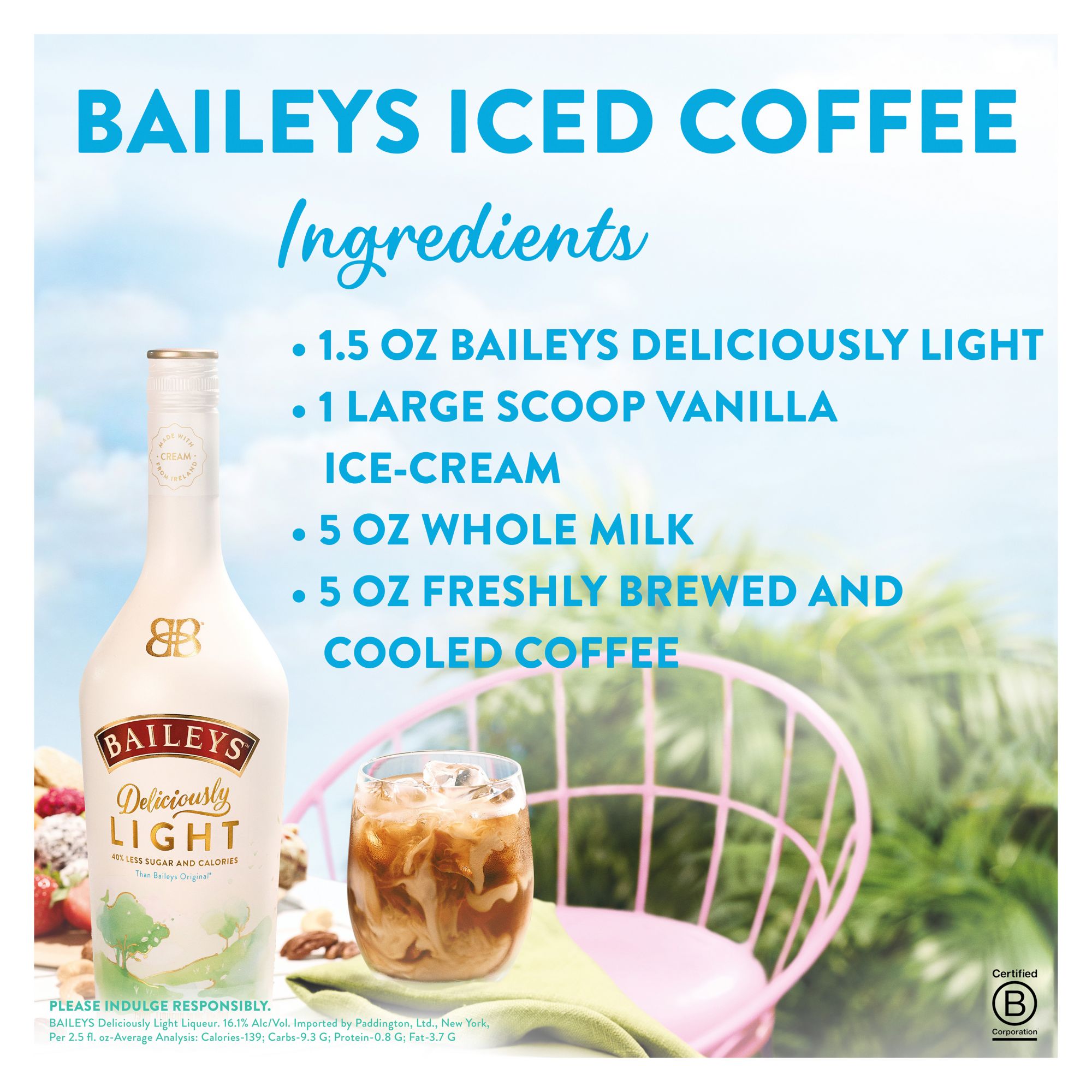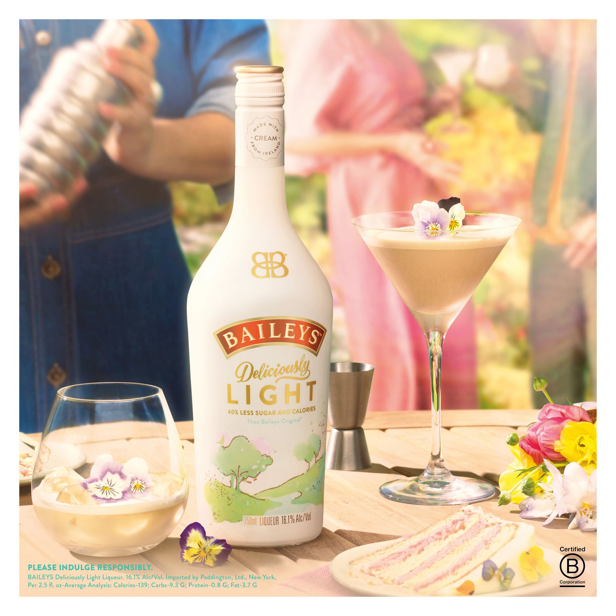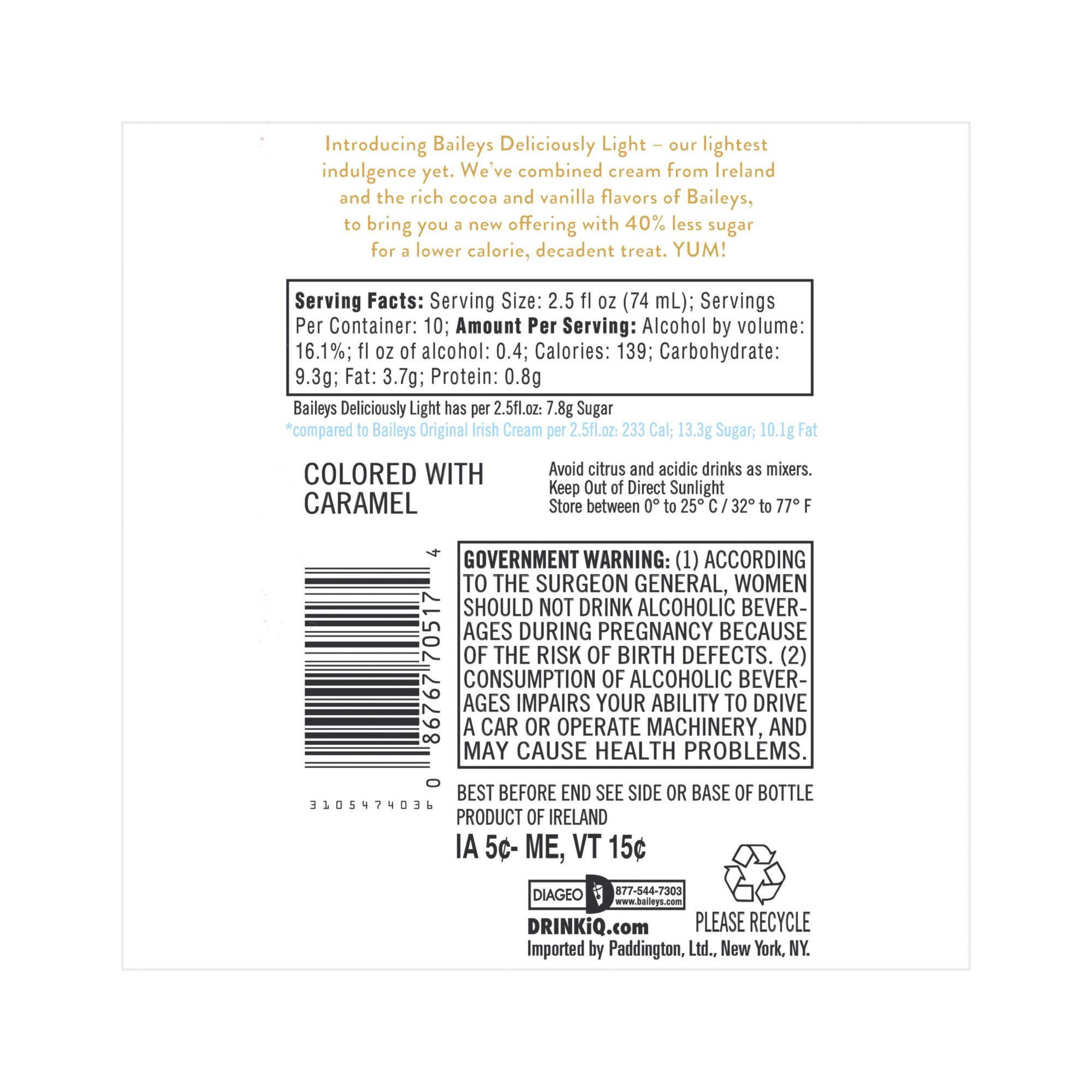 Indulge but keep it light with Baileys Deliciously Light. We've combined cream from Ireland and the rich cocoa and vanilla flavors of Baileys to create a sweet treat with 40% fewer calories and 40% fewer grams of sugar than Baileys Original Irish Cream.* Whether you're enjoying a light brunch or a relaxing evening at home, the silky vanilla and rich chocolate flavors of Baileys Deliciously Light are ready to make everyday moments a treat. Looking for a delicious low-calorie dessert option or after-dinner drink? Baileys Deliciously Light is the perfect choice. Includes one 32.2 proof 750 mL bottle of Baileys Deliciously Light. *Per 2.5 fl oz - Average Analysis: Calories - 139; Carbohydrates - 9.3g; Fat - 3.7g. Please enjoy responsibly.