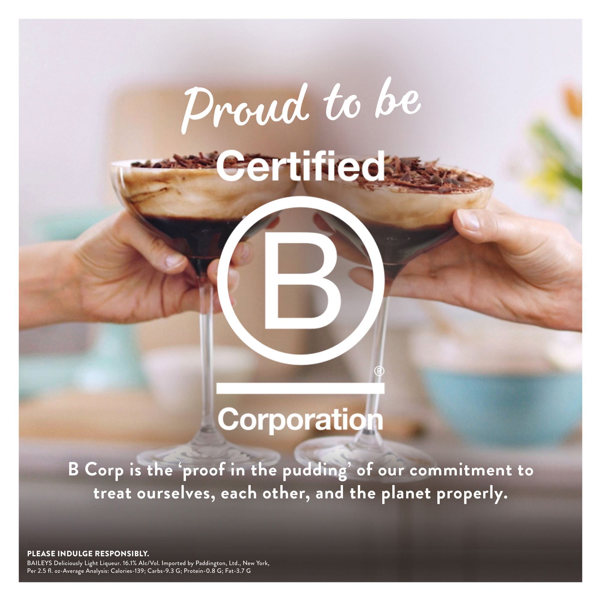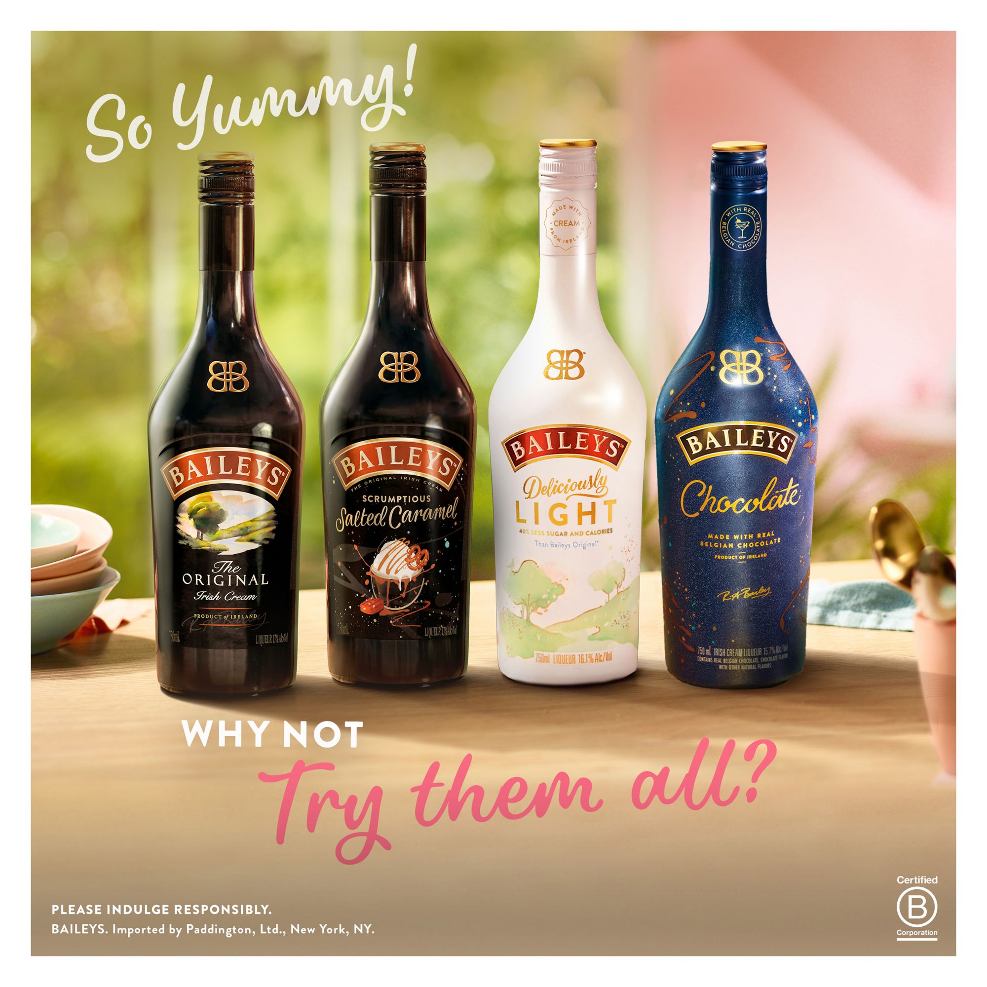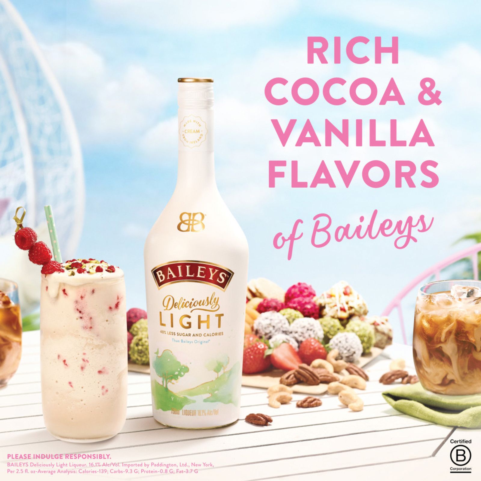 Indulge but keep it light with Baileys Deliciously Light. We've combined cream from Ireland and the rich cocoa and vanilla flavors of Baileys to create a sweet treat with 40% fewer calories and 40% fewer grams of sugar than Baileys Original Irish Cream.* Whether you're enjoying a light brunch or a relaxing evening at home, the silky vanilla and rich chocolate flavors of Baileys Deliciously Light are ready to make everyday moments a treat. Looking for a delicious low-calorie dessert option or after-dinner drink? Baileys Deliciously Light is the perfect choice. Includes one 32.2 proof 750 mL bottle of Baileys Deliciously Light. *Per 2.5 fl oz - Average Analysis: Calories - 139; Carbohydrates - 9.3g; Fat - 3.7g. Please enjoy responsibly.
