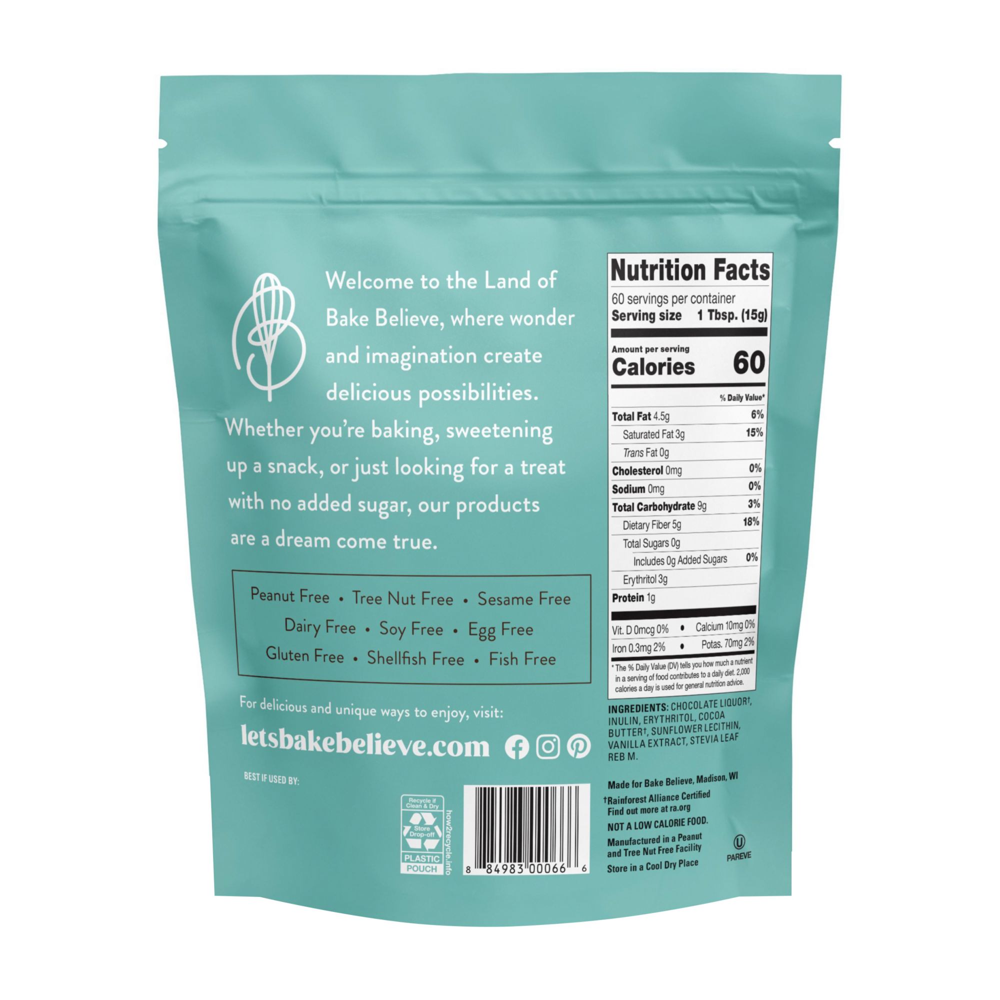 Bake Believe Dark Chocolate Flavored No Sugar Added Baking Chips are just what you've been looking for. This 32 oz. resealable bag is perfect to use for snacking or baking. These chips have a deep dark flavor with just the right amount of sweet. Bake Believe Dark chips have zero grams of sugar, are gluten free, dairy free, made in a peanut and tree nut free facility and are vegan. Try Bake Believe Dark Chocolate Flavored No Sugar Added Baking Chips, they are sure to become your new favorite.