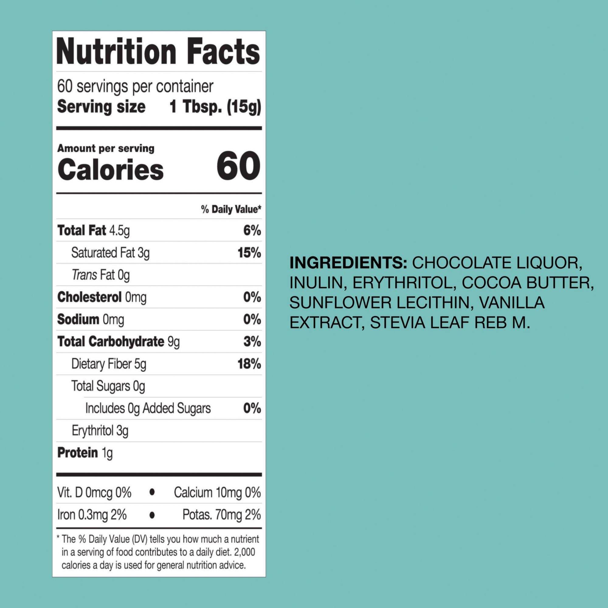 Ingredients: Chocolate Liquor, Inulin, Erythritol, Cocoa Butter, Sunflower Lecithin, Vanilla Extract, Stevia Leaf Reb M