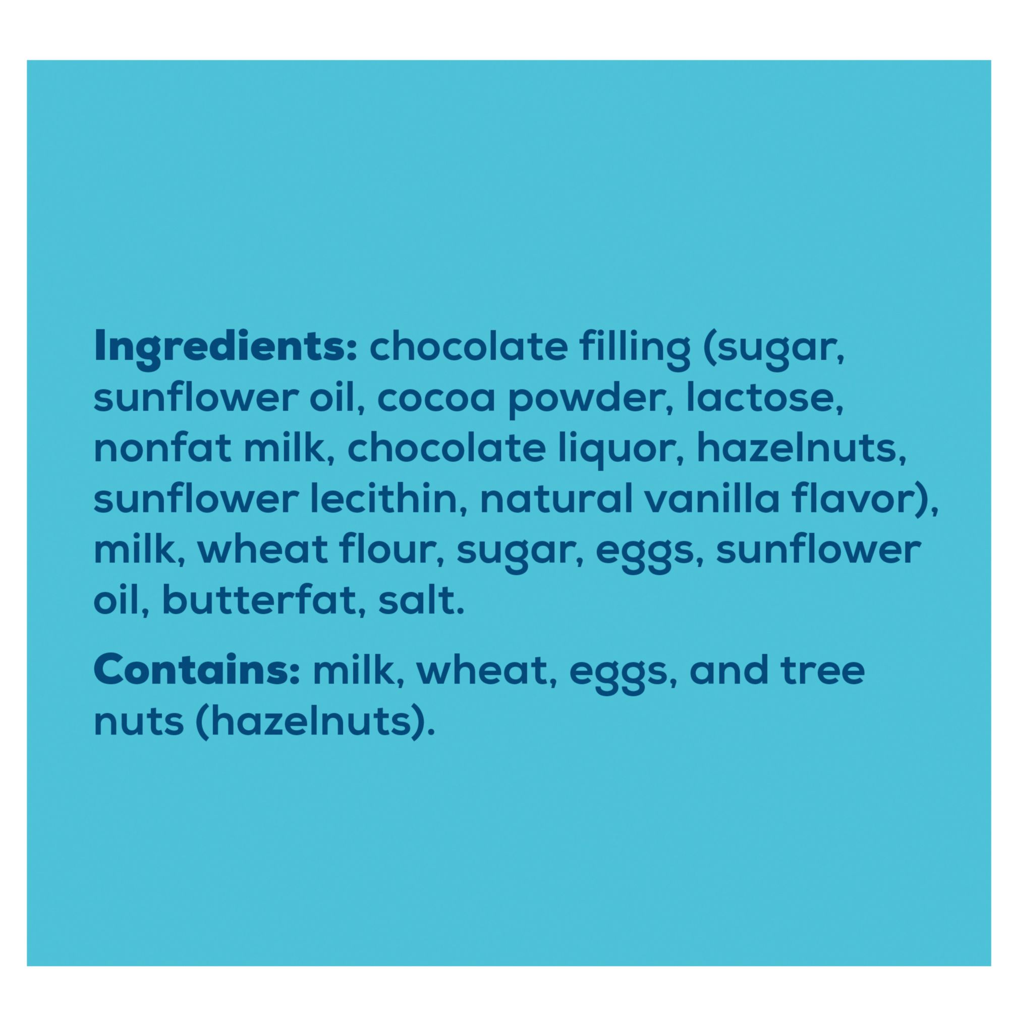 Ingredients: Chocolate Filling (Sugar, Sunflower Oil, Cocoa Powder, Lactose, Nonfat Milk, Chocolate Liquor, Hazelnuts, Sunflower Lecithin, Natural Vanilla Flavor), Milk, Wheat Flour, Sugar, Eggs, Sunflower Oil, Butterfat, Salt.