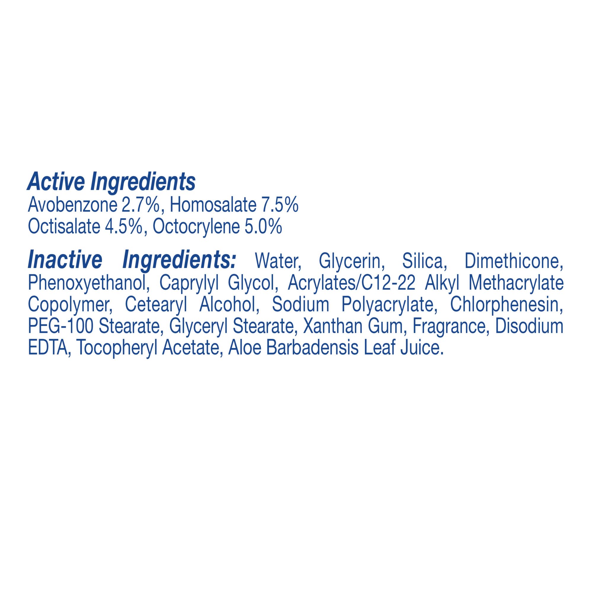 Ingredients: Avobenzone 2.7%, Homosalate 9%, Octisalate 4.5%, Octocrylene 6.5%.