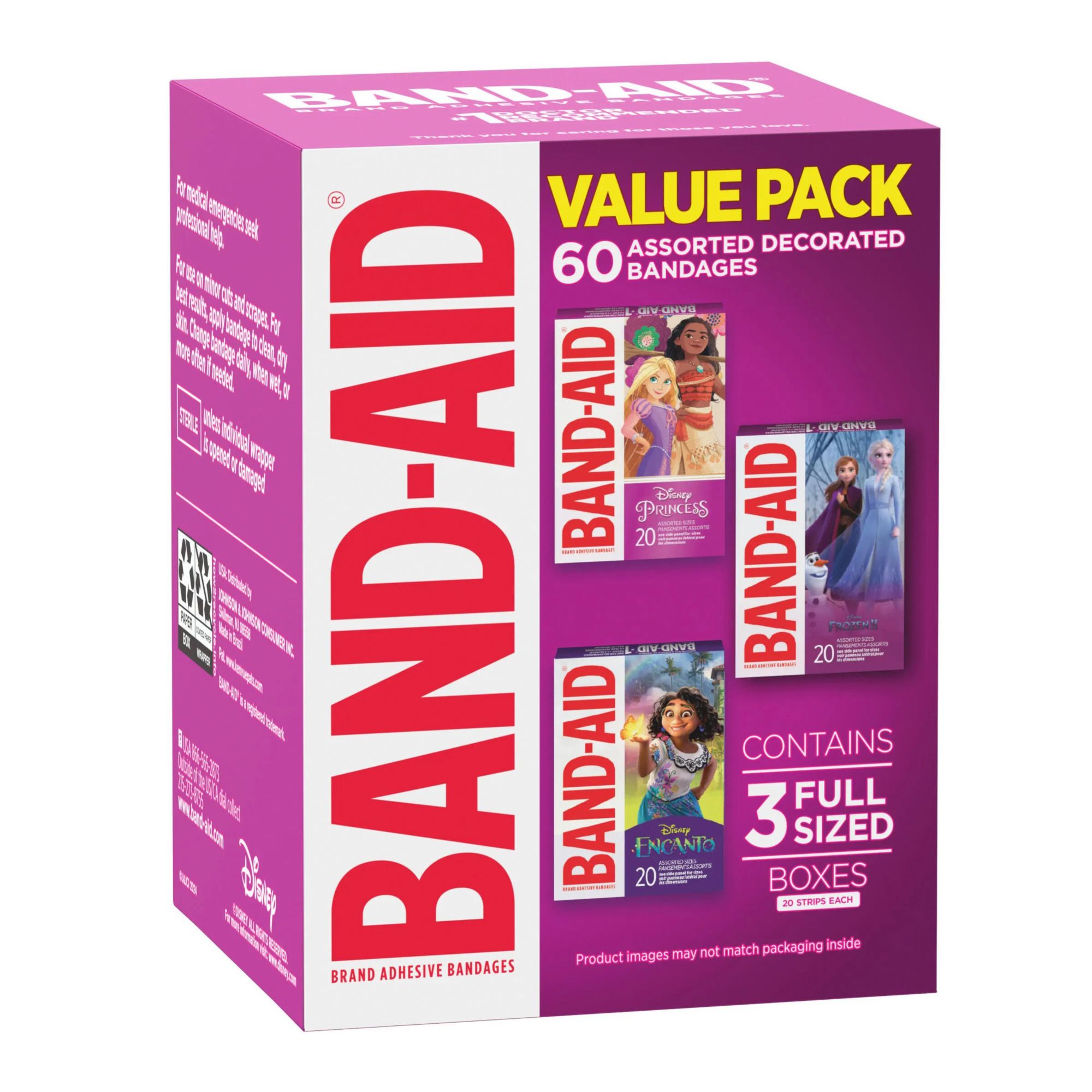 Three (3) boxes of Band-Aid Decorative Bandages - Disney Princess 20 ct., Frozen 20 ct. and Encanto 20 ct.