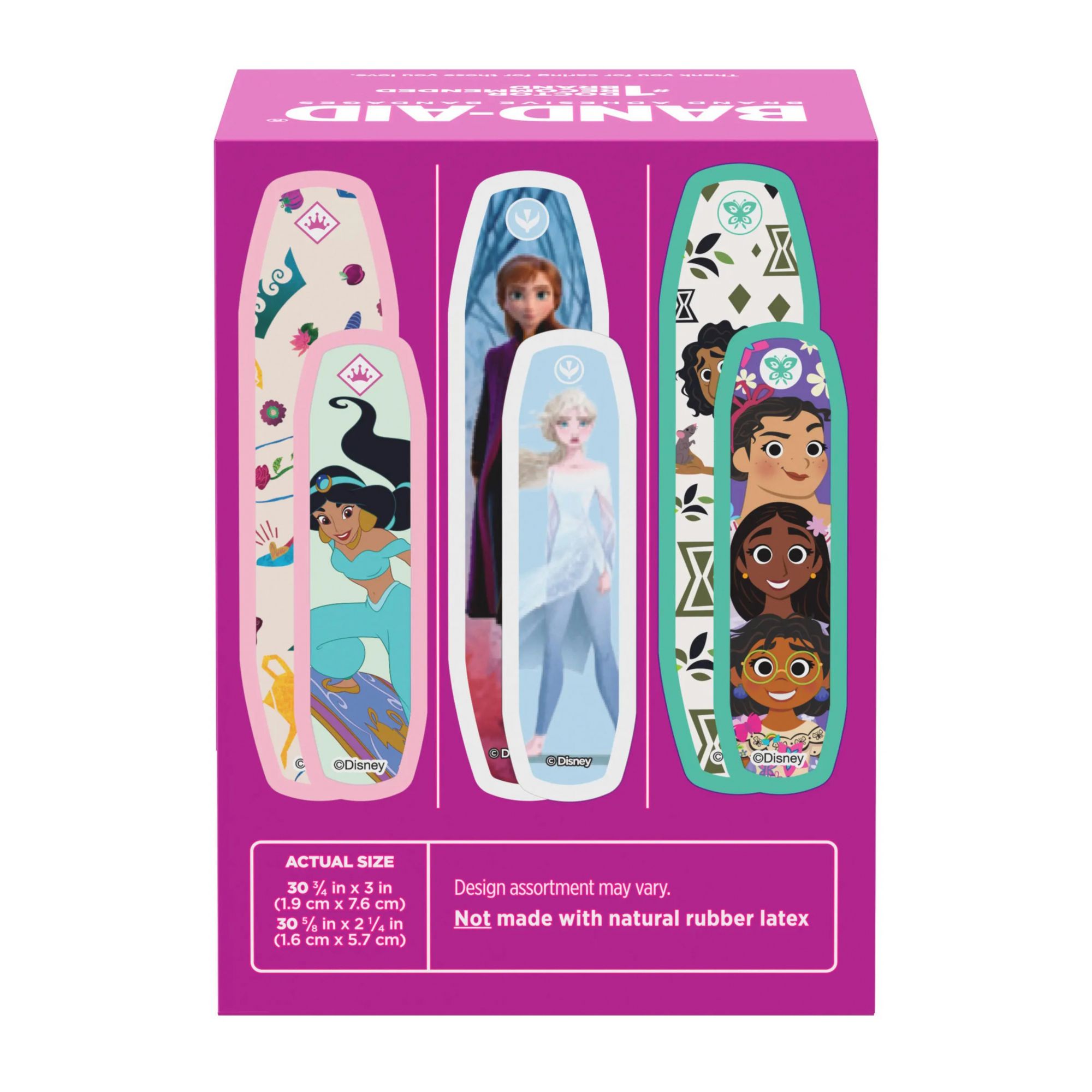Box of 60 Band-Aid Brand Adhesive Bandages featuring Disney Princesses Characters, Disney Frozen Characters and Disney Encanto Characters for first aid