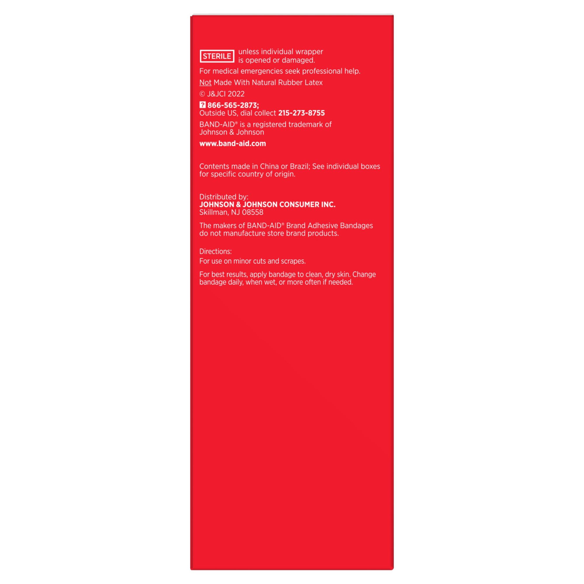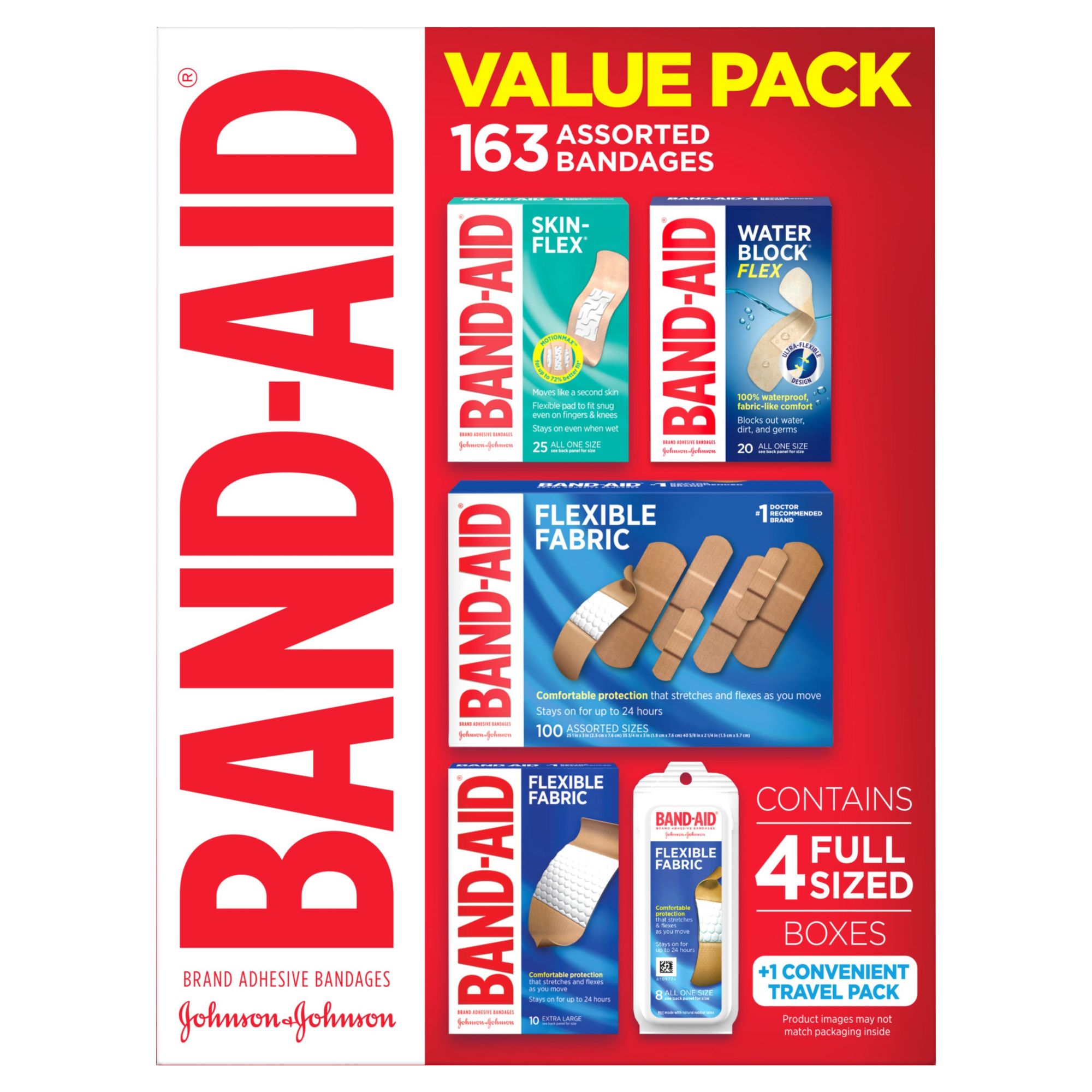 Band-Aid brand value pack of assorted bandages contains four full-sized boxes plus one travel pack Sterile adhesive bandages cover wounds to help protect against dirt & germs that may cause infection Bandages to feature quilt-aid comfort pads to cushion & protect wounds which may help prevent reinjury One 8 ct. travel pack of flexible fabric adhesive gentle bandages One 100 ct. box of assorted size sterile flexible fabric adhesive bandages One 10 ct. box of extra-large flexible fabric adhesive bandages for minor wounds One 20 ct. of waterproof water block flex adhesive bandages One 25-ct. of skin-flex adhesive bandages for lasting durability & exceptional comfort
