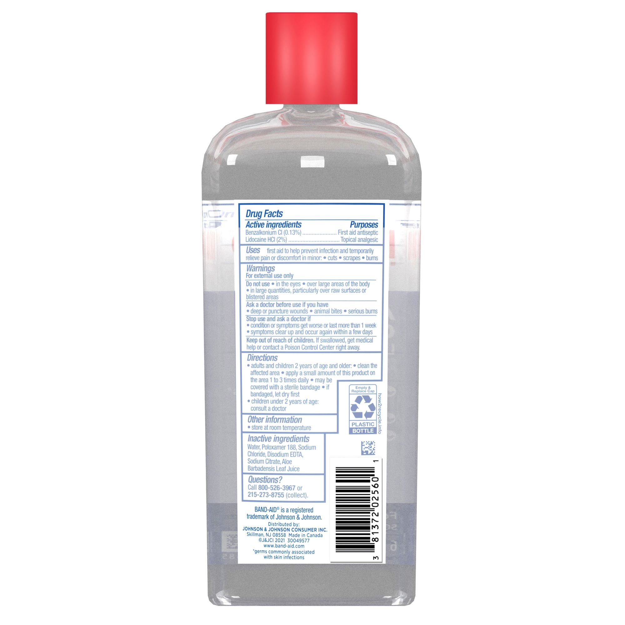 Clean and relieve the pain of minor wounds with Band-Aid Brand Pain Relieving Antiseptic Cleansing Liquid. Formulated with the topical analgesic lidocaine HCl, this antiseptic liquid helps relieve the pain and discomfort of minor cuts, scrapes, and burns. The skin cleaning antimicrobial liquid also contains benzalkonium Cl, a first aid antiseptic, and effectively kills 99.99% of germs* to help prevent infection. The perfect addition to any at-home first aid kit along with other essential wound care supplies, the first aid antiseptic liquid is safe and effective for wound care on kids ages 2 and older. To use, apply a small amount of antiseptic liquid on the affected area one to three times daily and once dry, cover the wound with a sterile bandage. *germs commonly associated with skin infections.