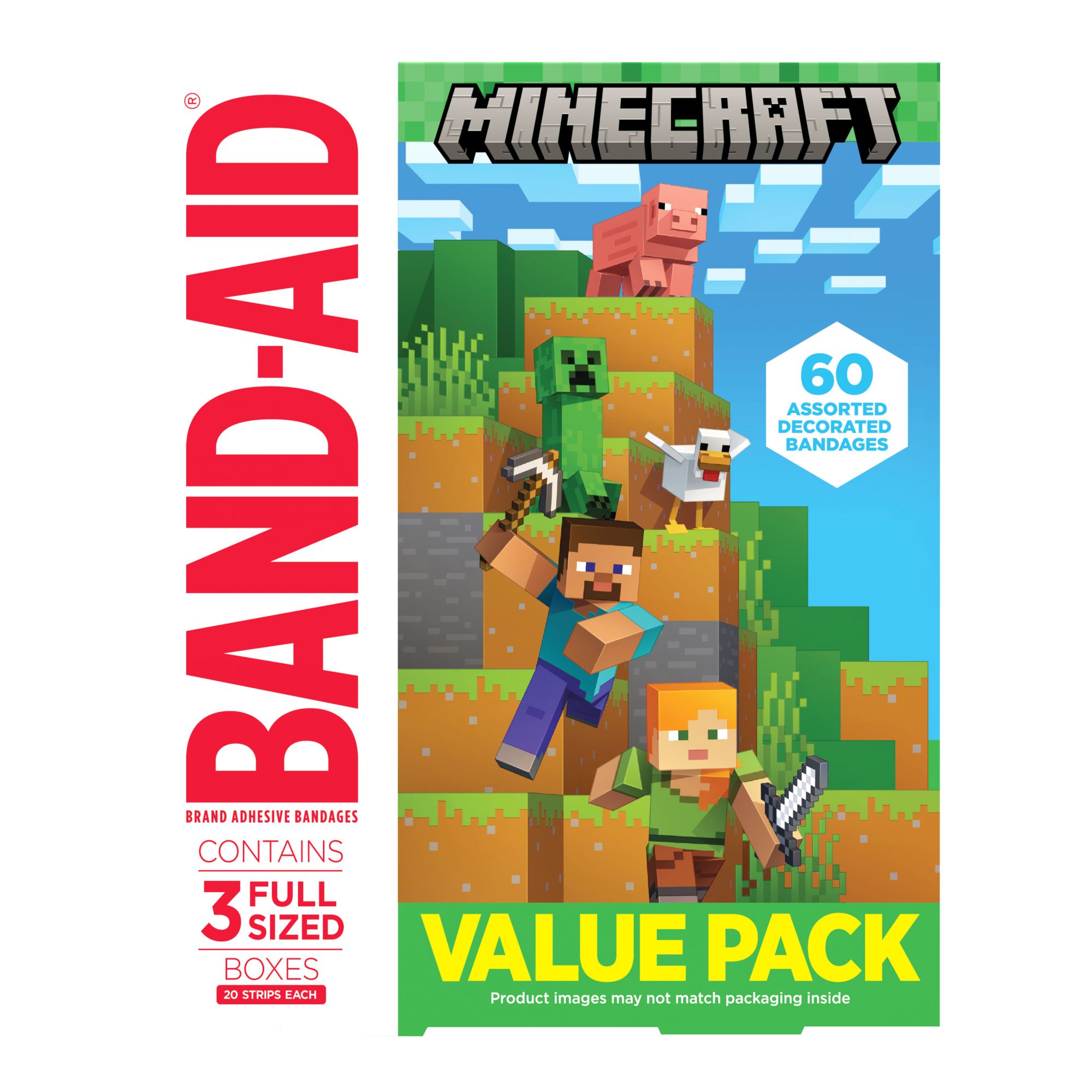 Cover and help protect your little one's minor wounds with Band-Aid brand adhesive first aid bandages featuring Minecraft characters. Perfect for kids and toddlers, these sterile, adhesive bandages from the number one doctor-recommended bandage brand are made to cover and help protect minor cuts, scrapes, and blisters from dirt and germs so they can heal better. Each individually wrapped bandage features a non-stick pad that doesn't stick to the wound for easy, painless removal. Decorated with fun, colorful designs featuring the characters from the hit franchise Minecraft, the bandages make first aid more fun. These sterile adhesive bandages come in different sizes, all ideal for covering small wounds, and make a perfect addition to any first-aid kit or at-home wound care supplies.