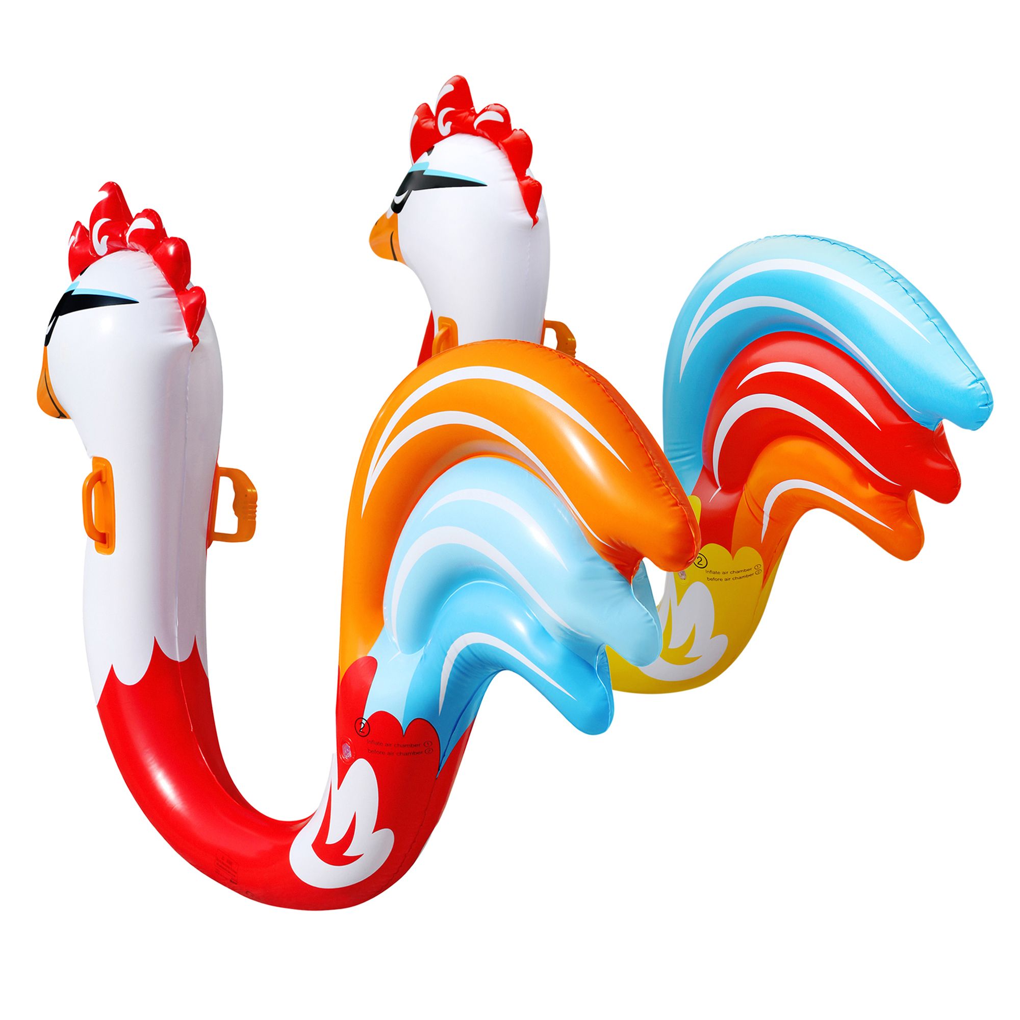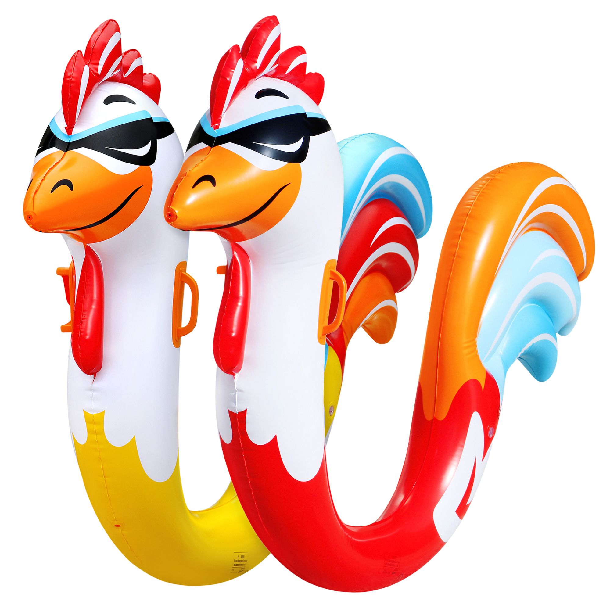 Includes two inflatable chicken riders, built-in water blasters, one repair patch
