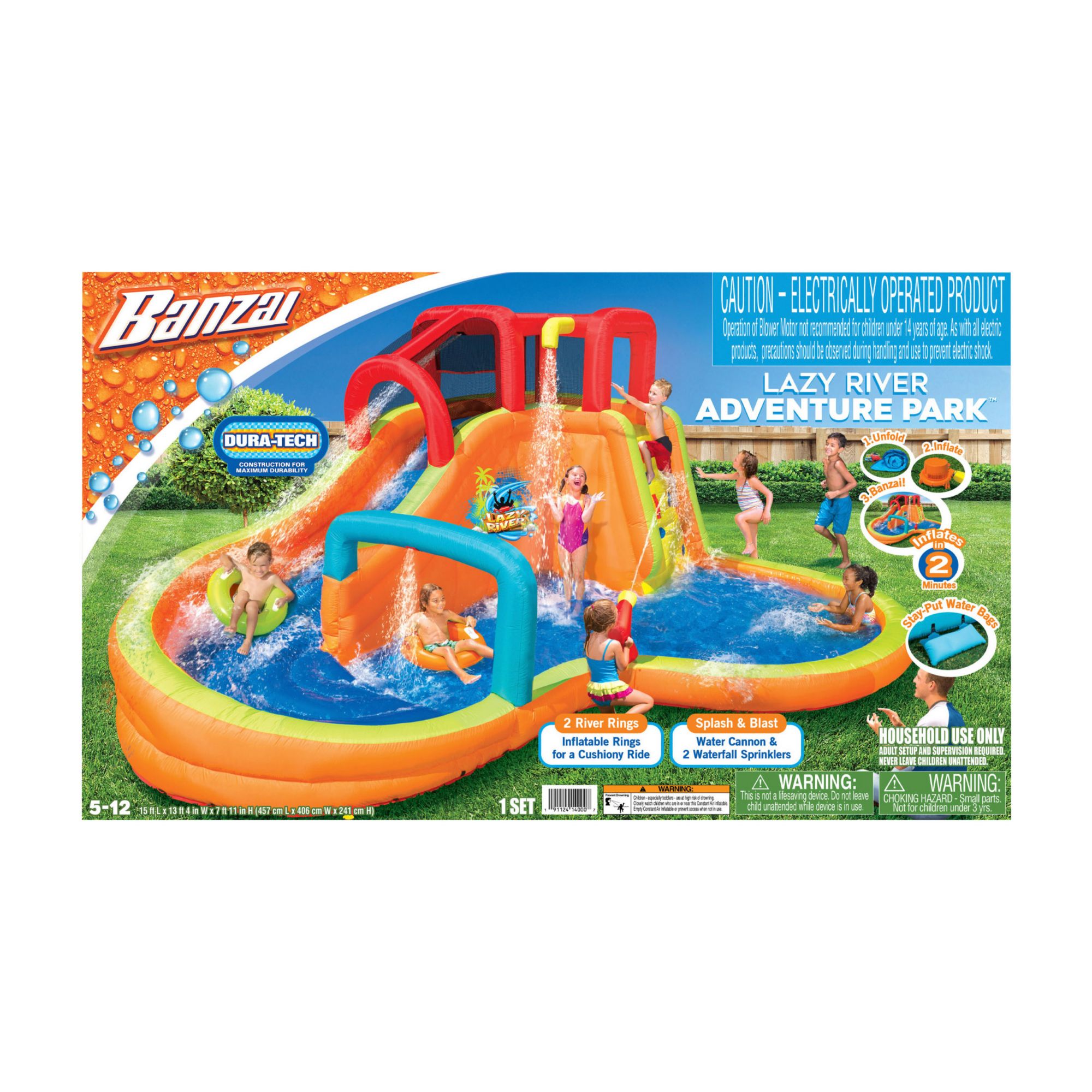 Dive into summer with the Banzai Lazy River Adventure Park. This water park features a long waterslide, a refreshing splash activity pool, fun overhead sprinklers, a water spraying arch, and a continuous water-blasting cannon. The Adventure Park is 15' long and over 13' wide so there is room for everyone to enjoy the aquatic excitement. The park can be set up easily with the included air blower so you can go from package to poolside in minutes. The Lazy River Adventure Park transforms your outdoor space into a water adventure zone, creating lasting memories, excitement, and splashes for the ultimate summer experience.