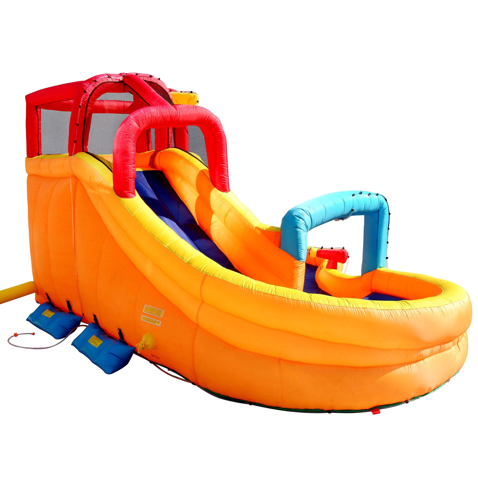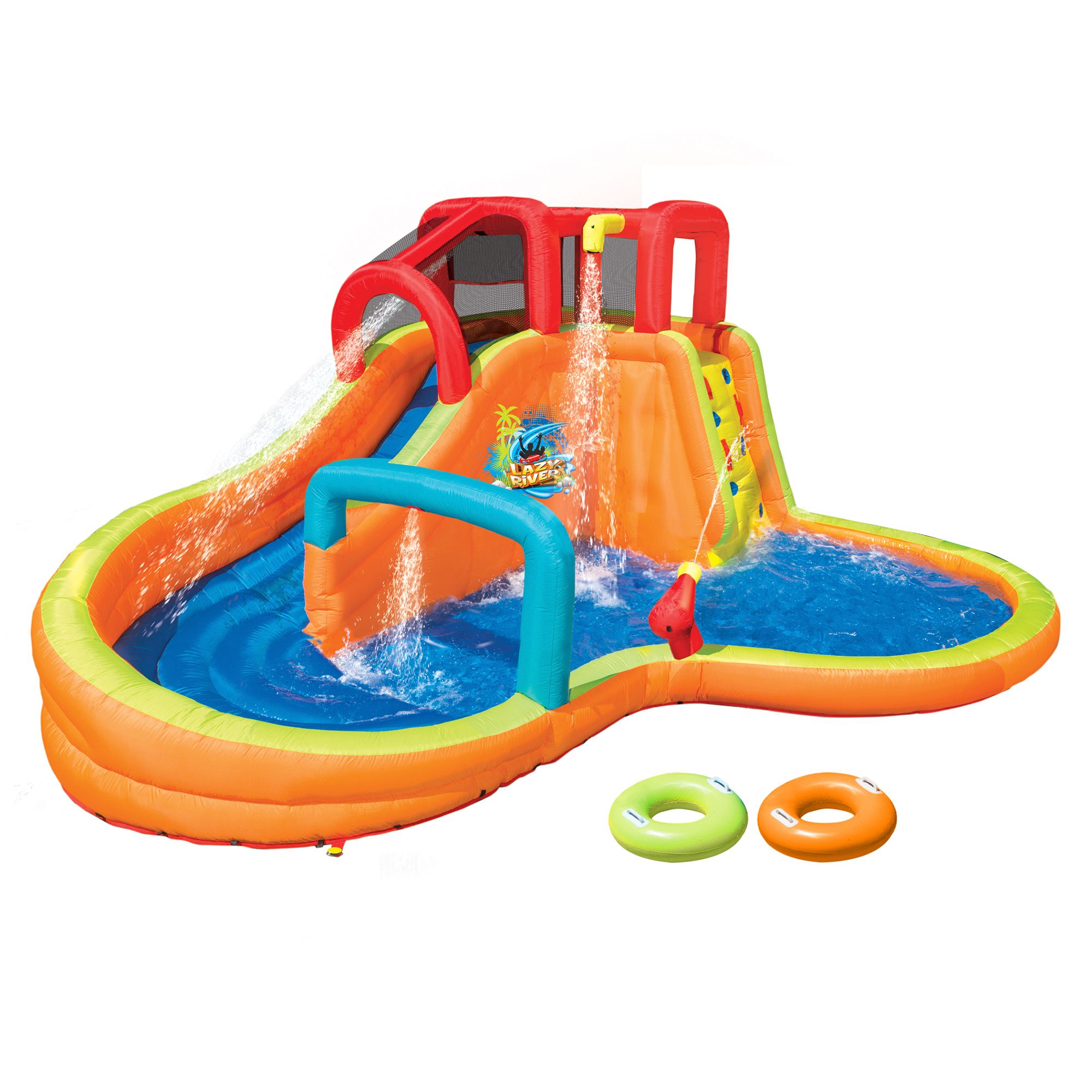 Features a built-in water-blasting cannon and two inflatable river rings to use while sliding down the slide