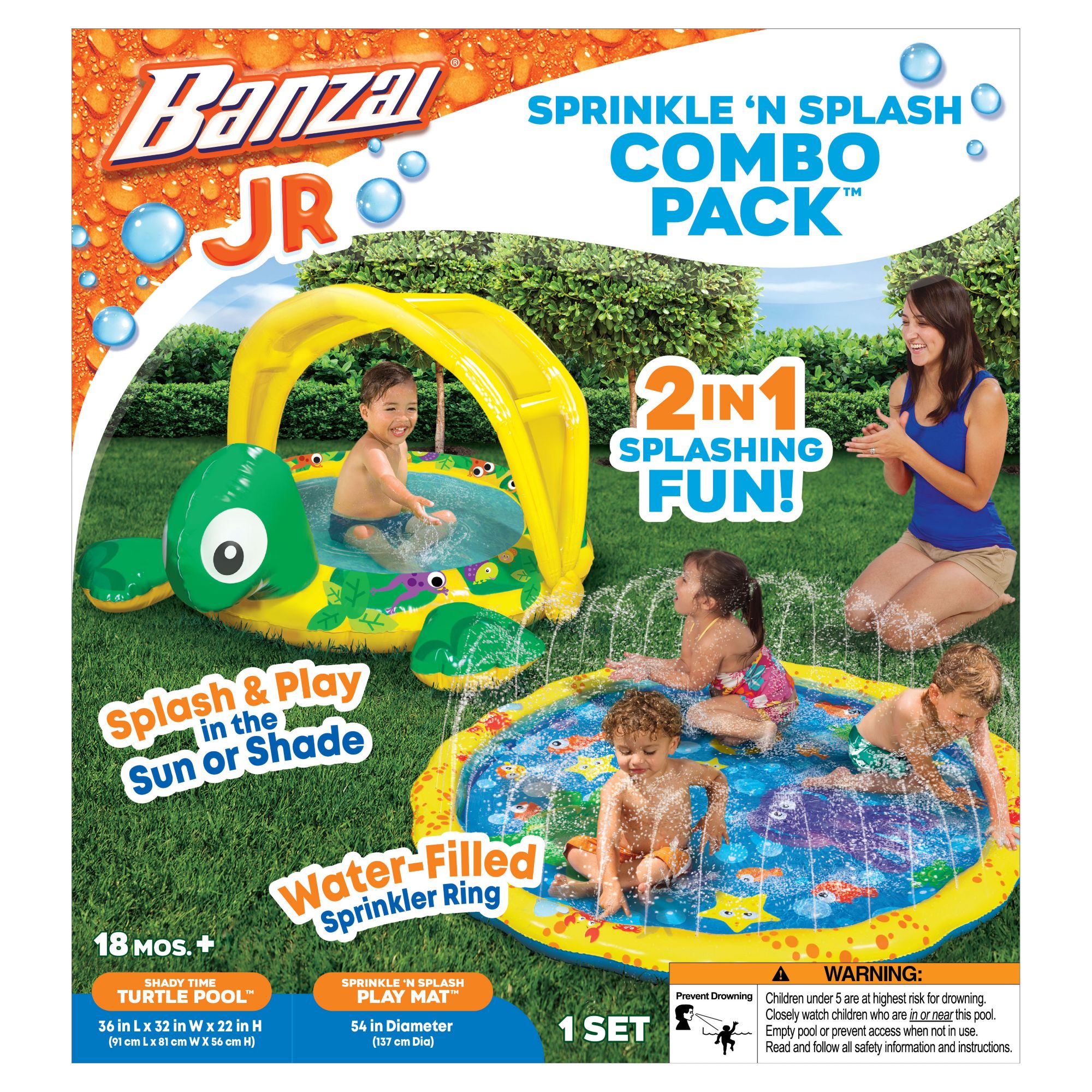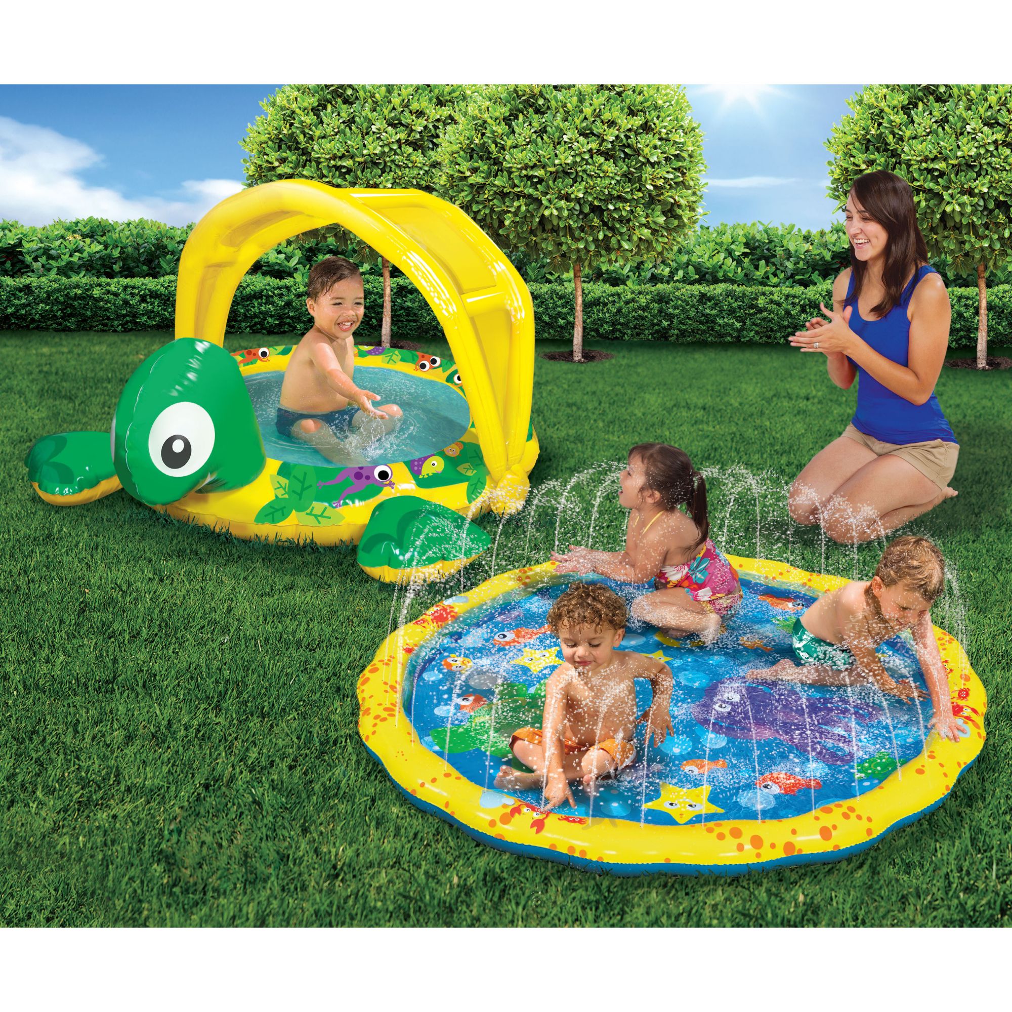 The Sprinkle 'N Splash Combo Pack includes The Shady Time Turtle Pool and Sprinkle 'N Splash Play Mat. The Shady Time Turtle Pool is the perfect way to introduce your child to fun water play. The inflatable canopy provides a cool shade as your child splashes and plays with a new turtle friend. Add a refreshing splash of fun with the Sprinkle 'N Splash play mat. Gentle water sprays come from the squishy water-filled rim and sprinkle onto the mat, providing just enough splash for your toddler. Fun ocean characters will bring smiles and keep your little one entertained all summer long.