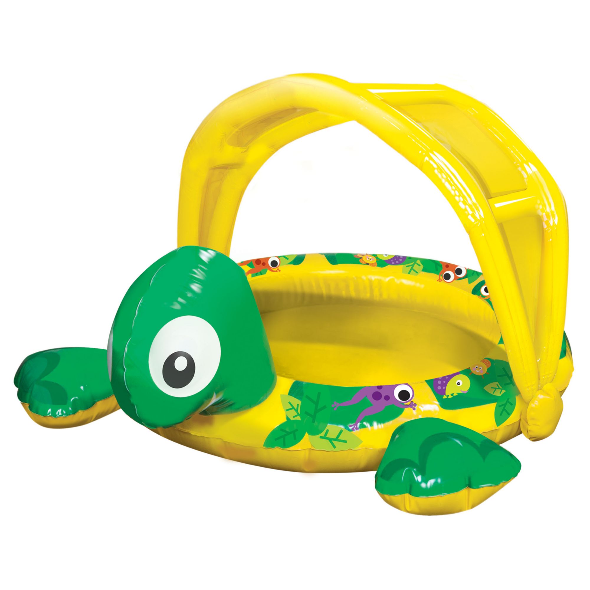 The Shady Time Turtle Pool introduce your child to fun water play The removable inflatable canopy provides cool shade Fun ocean characters will bring smiles and keep your little one entertained all summer long Age ranges: 18 months+ Includes one play mat, one inflatable pool, one inflatable sun canopy, one repair patch, and one water watcher tag