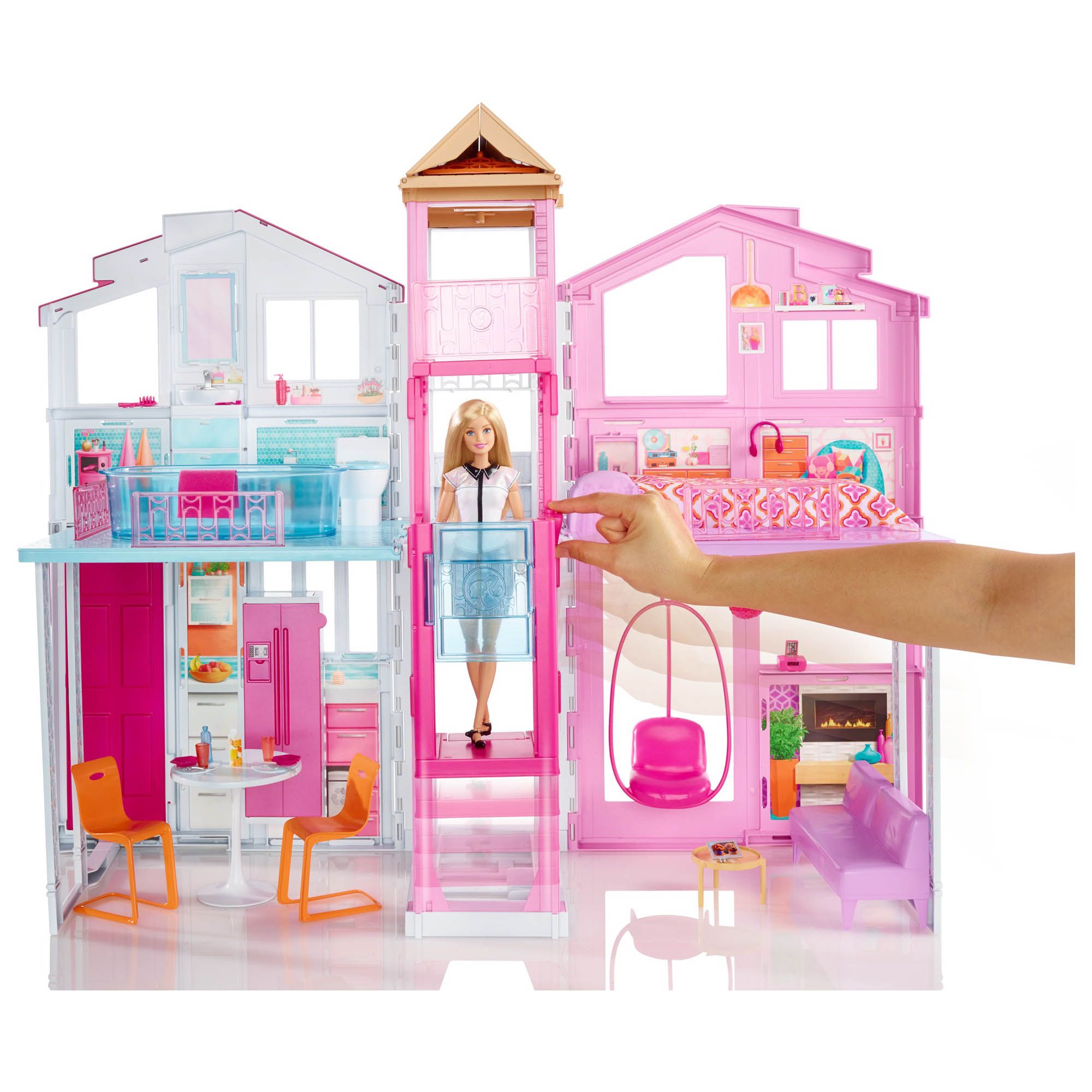 Three stories of deluxe townhouse home play space Four rooms and a rooftop lounge, all with realistic details, make your Barbie doll’s newest home ultra-deluxe Sleek child-activated elevator Kitchen and living room on first floor Bathroom and bedroom on the second floor Upstairs closet for Barbie doll fashions Contemporary swinging chair in living room opens up so Barbie doll can swing on the inside or the outside of the house Furniture pieces feature contemporary designs and include a table and two chairs, a sofa, a coffee table, a bed, a bathtub and a swinging chair Additional accessories, such as a towel, place settings for the kitchen, and doll-sized tablet device, add to the storytelling possibilities Arrange furniture and accessories to suit your style and your stories Ages 3+ Includes three-story townhouse with working elevator and pop-up umbrella, furniture, and accessories