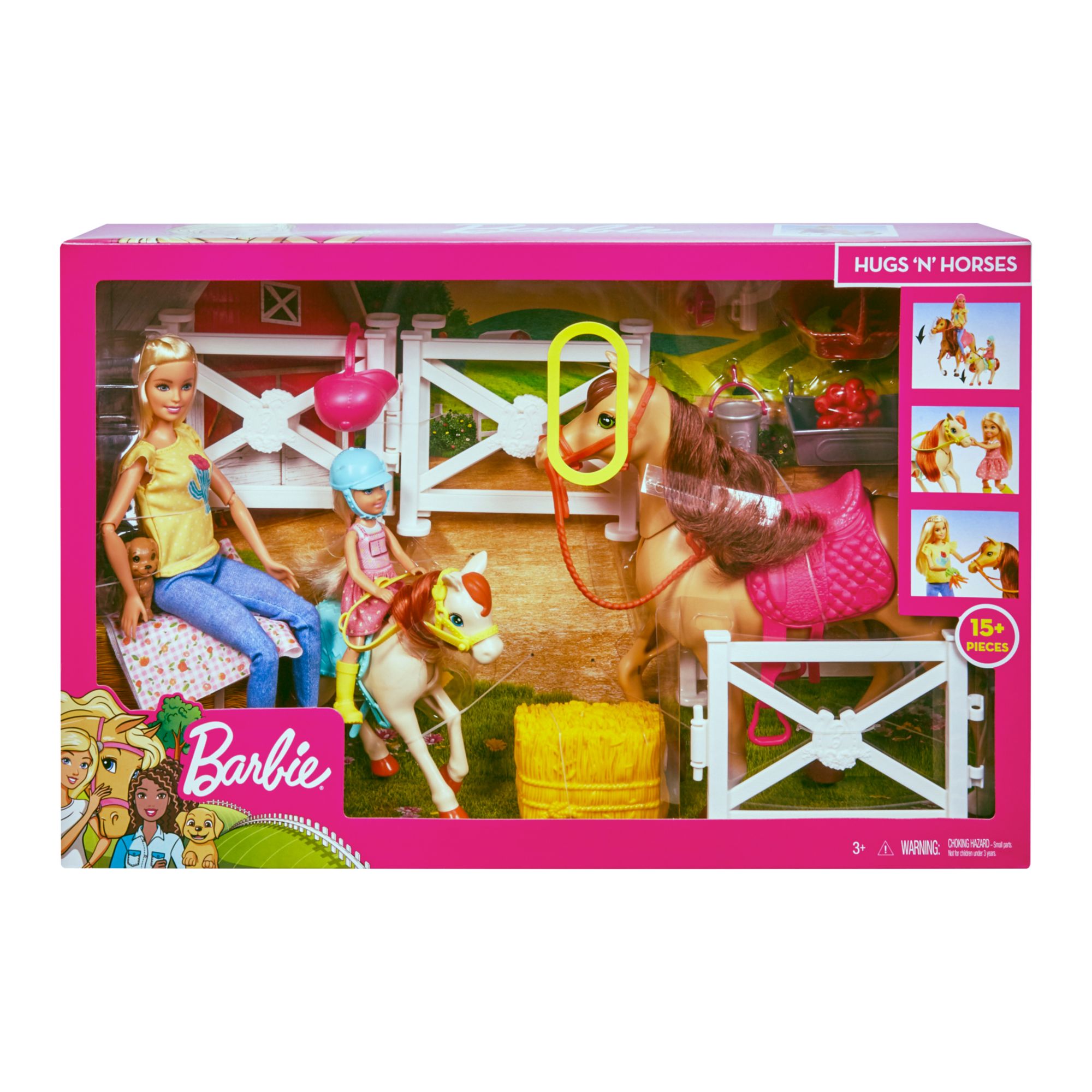 Barbie doll and her little sister Chelsea doll let young horse lovers play out their dreams of owning their horses with the Barbie Hugs 'n' Horses doll and horse playset-more than 15 pieces include two dolls, a horse, a pony, and a puppy, plus accessories to create a corralled space and care for the pets. And it's easy to feel the love of horse and pony both have bobbling heads that mimic real movement for nuzzling and hugs. Soft manes and tails add to the realism and immersive experience. Kids can play out feeding, grooming, and horseback riding while telling stories of friendship, family, and adventure. Imaginations can ride anywhere because when a girl plays with Barbie, she imagines everything she can become. Dolls cannot stand alone. Colors and decorations may vary.