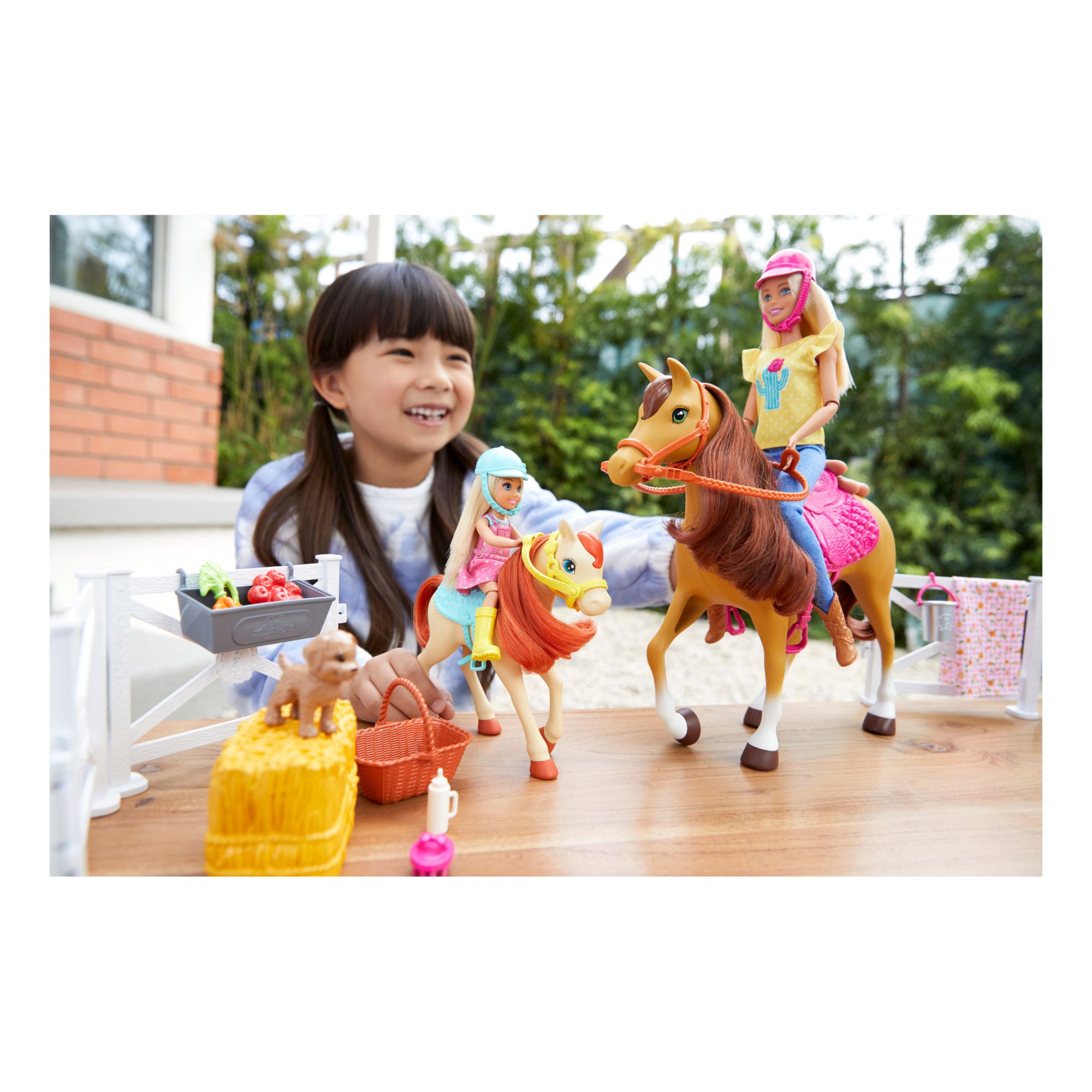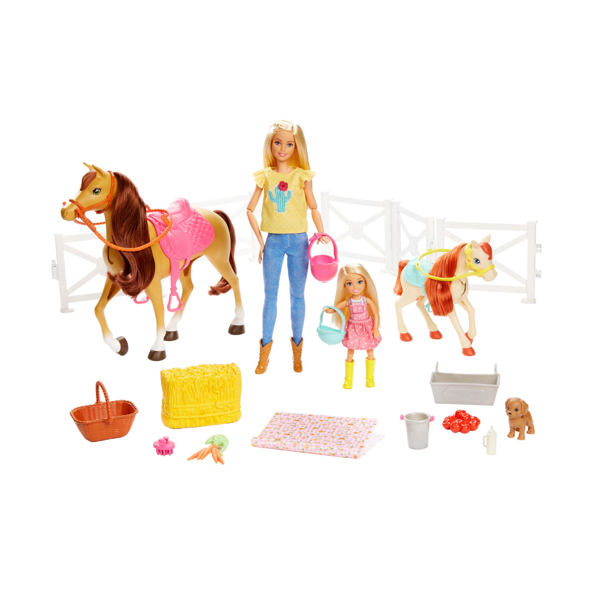 Includes two dolls, two horses, a puppy and 15+ accessories