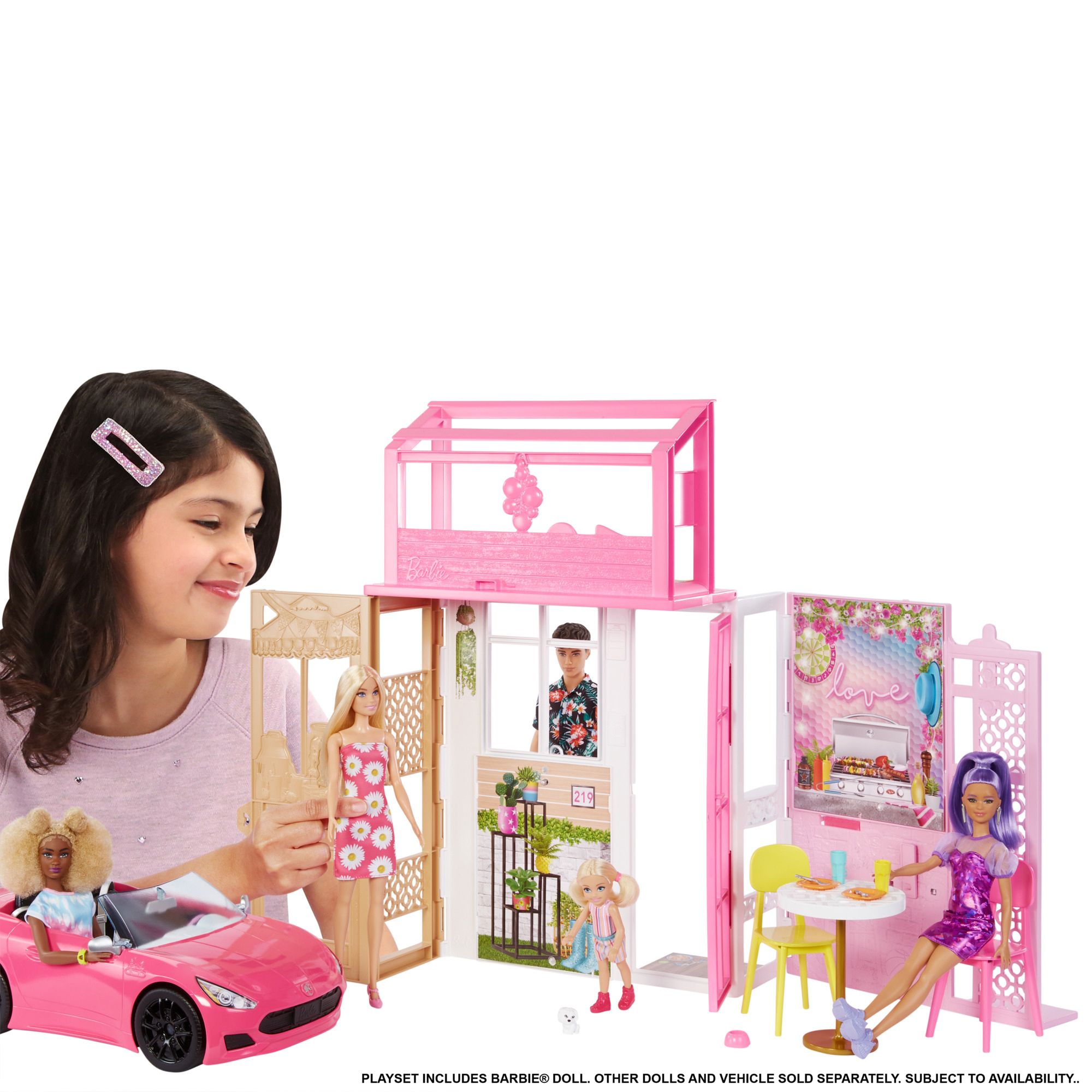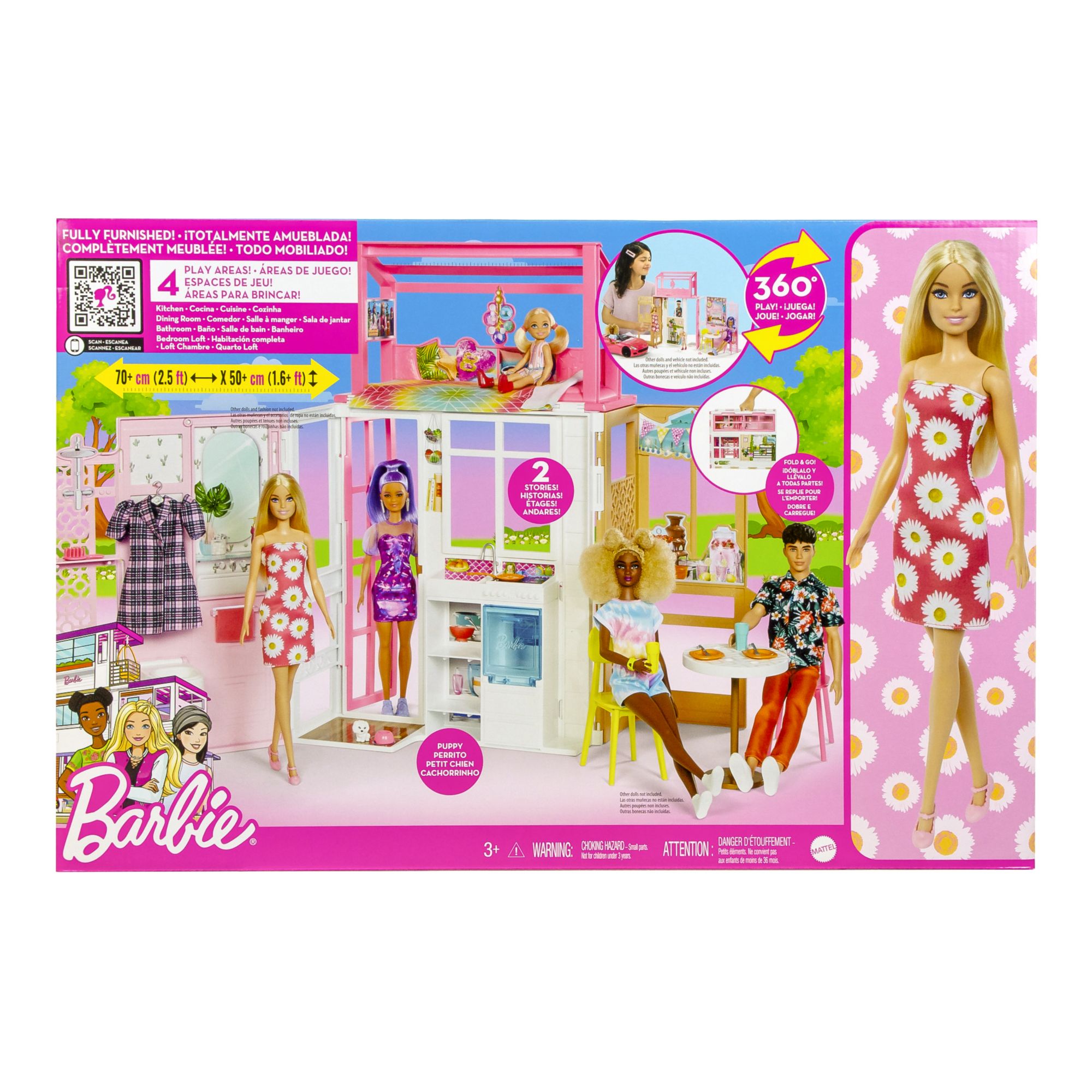 Imaginations are invited to move right into this Barbie dollhouse featuring 360° play, two stories, four play areas, and tons of storytelling pieces. This fully furnished Barbie house features a modern design with signature Barbie style and everything kids need to play out their stories, including Barbie doll and her adorable pet puppy. Welcome friends at the front door, cook up fun in the kitchen and serve at the dining table featuring seating for two. After a day of play, kids can tuck Barbie doll into the loft bed for a cozy night of sleep. Fun furnishings and accessories inspire endless storytelling, and when playtime's over, the entire set folds for easy clean-up and on-the-go fun. With so many storytelling opportunities, this Barbie house makes a great gift for kids. Colors and decorations may vary.