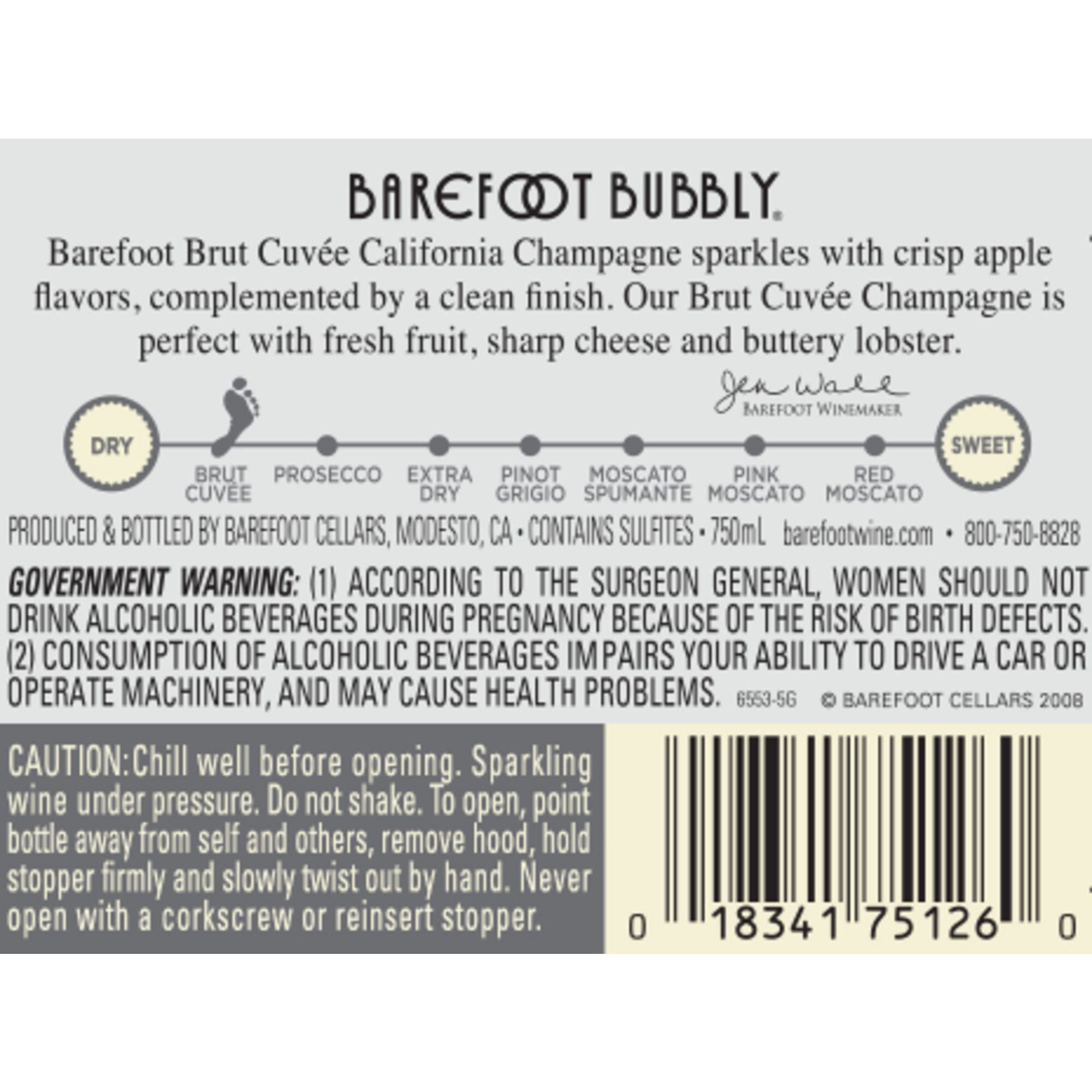 Make any occasion taste special with Barefoot Bubbly Brut Cuvee. This lively sparkling wine delivers vibrant notes of sliced apple, juicy peach and zesty kiwi, leading to a crisp, refreshing finish. It's the driest Barefoot Bubbly. When enjoyed on its own, it is best served chilled or mixed in a cocktail. This sparkling wine pairs perfectly with fresh fruit, cheese trays, buttery popcorn or seafood dishes. Whether it's Sunday brunch with your favorite person, tailgating before your team's big game, or a bridal shower for your best girlfriend, you can count on Barefoot Bubbly Brut Cuvee Champagne for fun wherever you bring it. Each 750 mL bottle contains about 6 glasses of sparkling wine with 10.5% alcohol by volume. The convenient twist and pop cork ensure no wine opener is needed, making it easy to pop a bottle and celebrate anytime, anywhere. Bottled in California, Barefoot is the most awarded wine brand in U.S. competitions. In addition to Brut Cuvee, Barefoot Bubbly is also available in Brut Rose, Pink Moscato and other varieties.