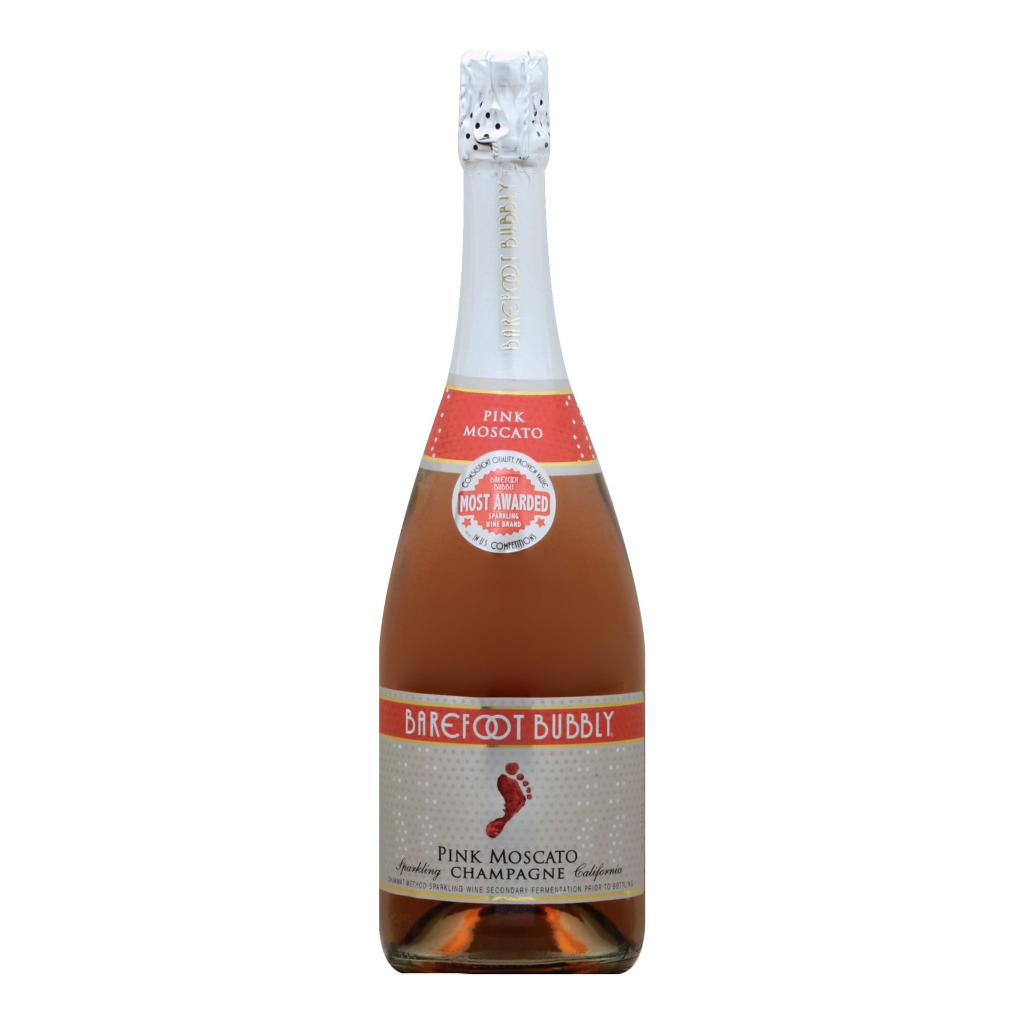 Barefoot Bubbly Pink Moscato Champagne delivers sweet, fruity notes of strawberries, peaches and fresh berries. With a creamy, refreshing finish, this sparkling Moscato wine pairs perfectly with everything from cheeses to sweet treats. Enjoy this pink sparkling wine from California chilled or mixed in a cocktail. A convenient twist and pop cork ensures no wine opener is needed. This bubbly Moscato is the sweetest sparkling wine offered by Barefoot, the most awarded wine brand in US competitions. Let's get Barefoot.