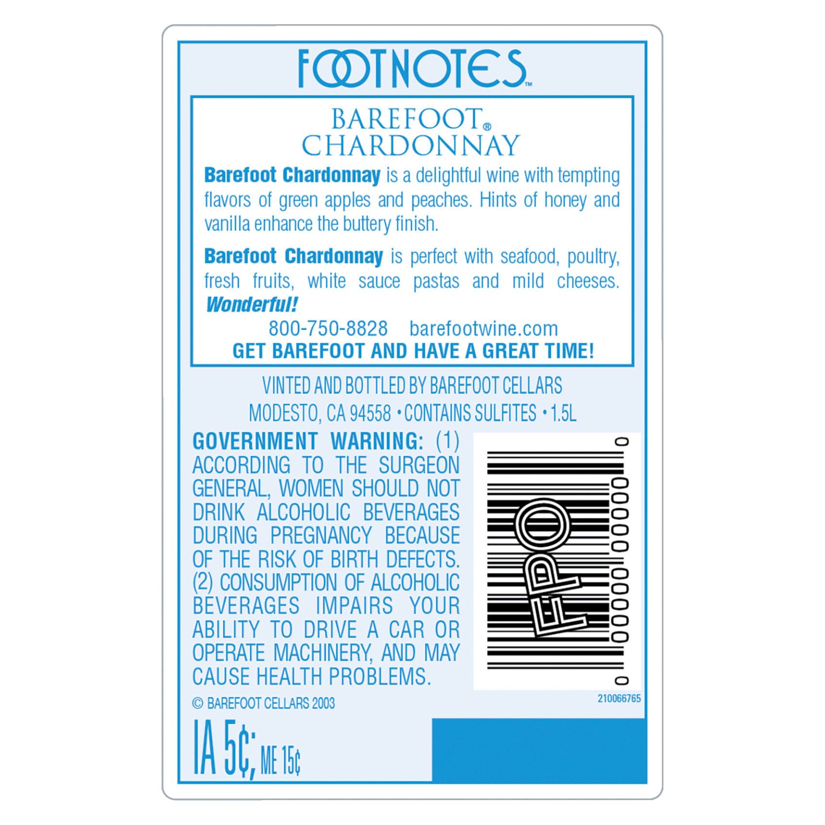 Make any occasion taste special with Barefoot Cellars Chardonnay White Wine. This bright white wine is made with Chardonnay grapes and features notes of crisp green apples, sweet peaches, and highlights of honey and vanilla. More dry than sweet, this Barefoot wine delivers bold flavor with a smooth finish. This dry wine is best served chilled and pairs perfectly with everything from seafood and poultry to fresh fruits and mild cheese. It's also the ideal wine for making cocktail recipes, like a Jalapeno Chard-Nilla Paloma. Barefoot Cellars Chardonnay White Wine is great for a variety of occasions, whether you're entertaining friends and family at an outdoor party or you need a wine gift for your best girlfriend. Each 1.5 L bottle contains about 12 glasses of wine with 13% alcohol by volume. Produced and bottled in California, Barefoot is the most awarded wine brand in U.S. competitions. In addition to Chardonnay, Barefoot wine is also available in Moscato, Rose, Pinot Grigio and other varieties.
