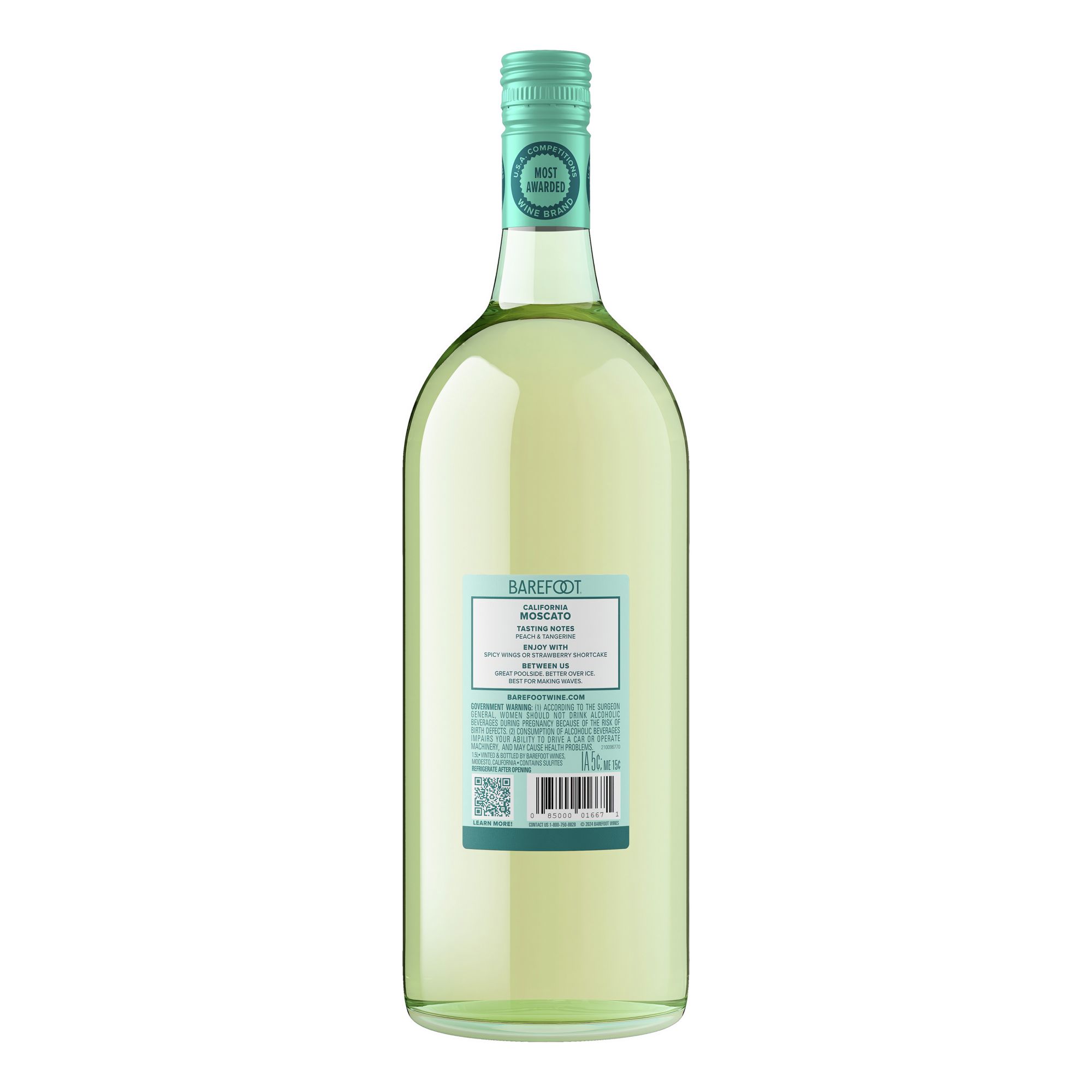 Deliciously sweet. Barefoot Moscato is a sweet wine with delicious mouth-watering flavors of juicy peach and apricot. Hints of lemon and orange citrus complement a crisp, refreshing finish. Barefoot Moscato is perfect with spicy Asian cuisine, light desserts, fresh fruit, and mild cheeses. Tasty! Barefoot supports the efforts of organizations that help keep America's beaches Barefoot friendly. Get Barefoot and have a great time! Barefoot's Moscato Blends have won Double gold! 2014 New York World Wine Competition. Consistent quality, proven value. White wine. barefootwine.com. Alc 9% by vol. Vinted and bottled by Barefoot Cellars, Modesto, CA 95354.