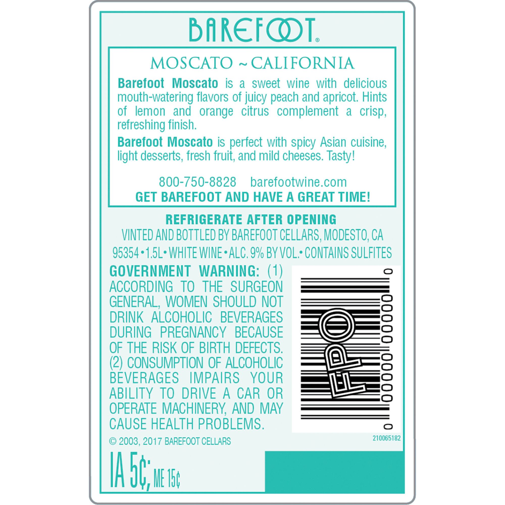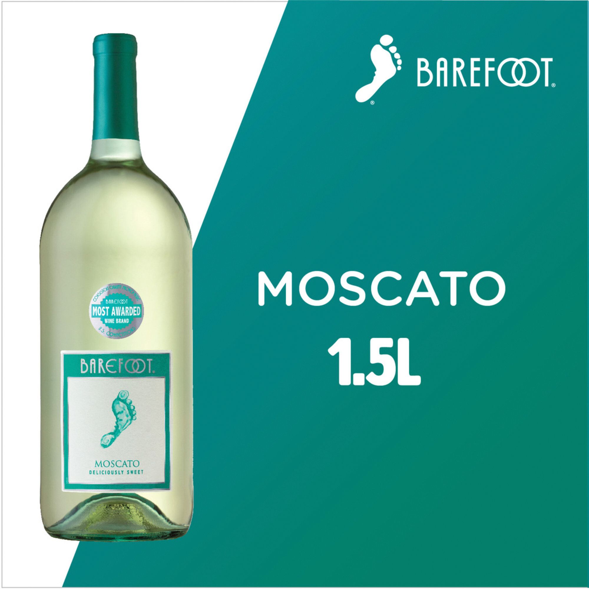 Make any occasion taste special with Barefoot Cellars Moscato. A sweet, lively white wine with light, crisp acidity, this wine is made with Moscato grapes. Tropical aromas of pineapple and orange blossom meet highlights of juicy peach, honey and lemon zest for a perfectly refreshing finish. This white wine is best served chilled and pairs perfectly with spicy Asian cuisine, artisanal cheeses or light dessert. It's also the ideal sweet wine for making cocktail recipes, like a Moscato Strawberry Lemonade. Each 1.5 L bottle contains about 12 glasses of wine with 9% alcohol by volume. Bottled in California, Barefoot is the most awarded wine brand in U.S. competitions. In addition to Moscato, Barefoot wine is also available in Pinot Grigio, Rose, Chardonnay and other varieties.