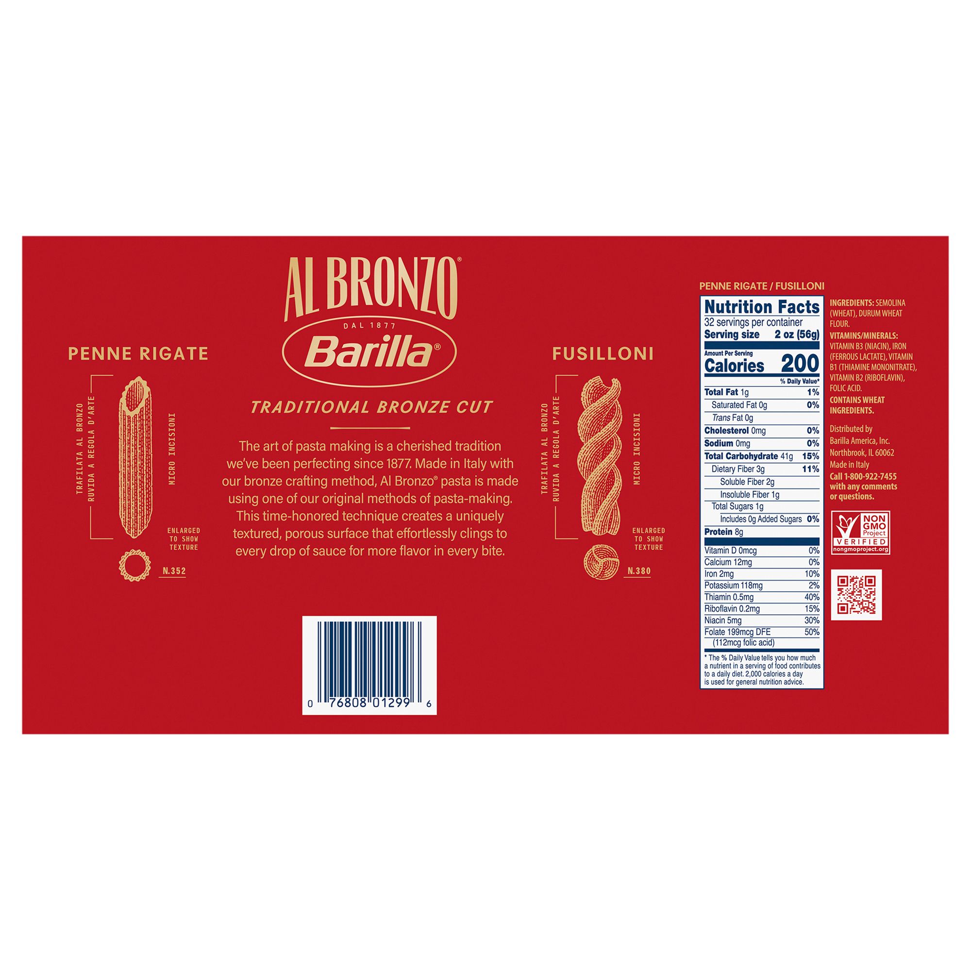 Made with the highest quality durum wheat, Barilla Al Bronzo pasta is expertly crafted using innovative micro-engraved bronze dies for a robust texture and an extraordinary grip on pasta sauce. Our Al Bronzo pasta is made with a custom blend reserve batch Non-GMO durum wheat. Elevate everyday with Barilla's Al Bronzo. Our Al Bronzo Barilla pasta is Non-GMO verified, peanut-free and suitable for a vegan or vegetarian diet. Perfect for pairing with your favorite pasta sauce.