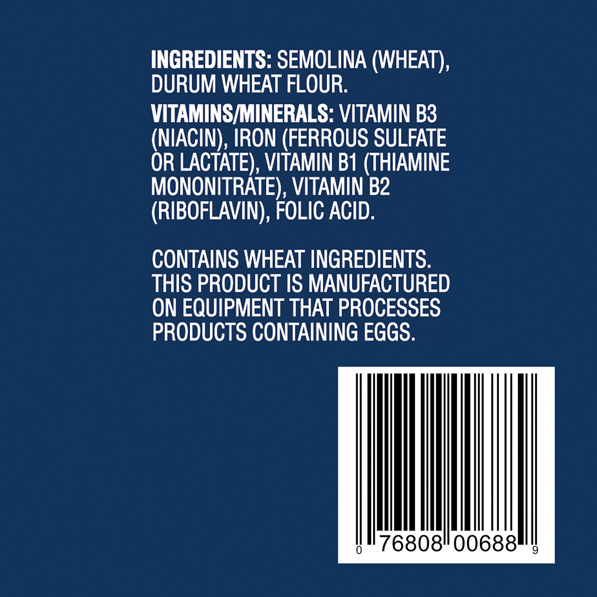 Ingredients: Semolina (Wheat), Durum Wheat Flour. Vitamins/Minerals: Vitamin B3 (Niacin), Iron (Ferrous Sulfate), Vitamin B1 (Thiamine Mononitrate), Vitamin B2 (Riboflavin), Folic Acid.