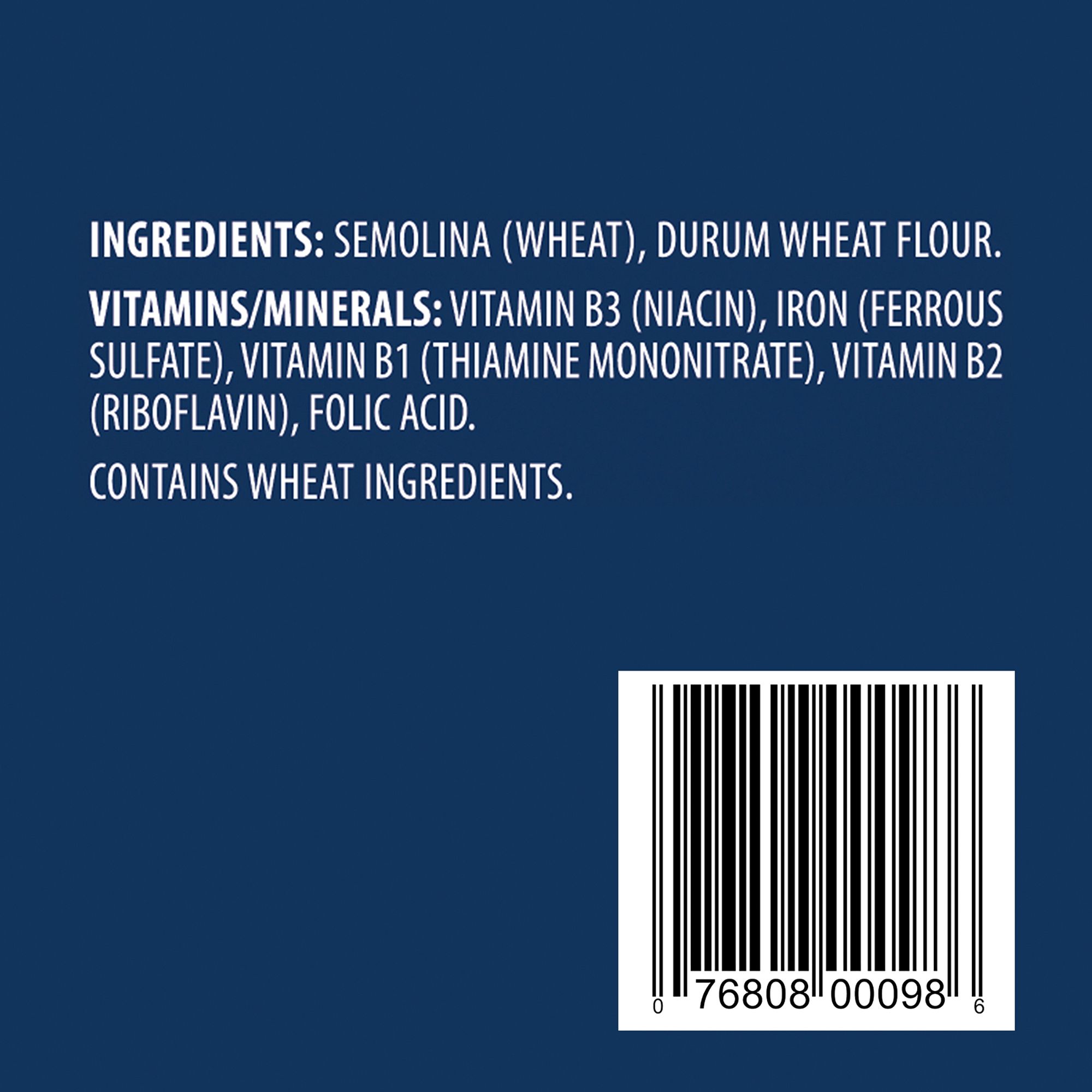 Ingredients: Rotini: Semolina (Wheat), Durum Wheat Flour. Vitamins/Minerals: Vitamin B3 (Niacin), Iron (Ferrous Sulfate), Vitamin B1 (Thiamine Mononitrate), Vitamin B2 (Riboflavin), Folic Acid. Farfalle: Semolina (Wheat), Durum Wheat Flour. Vitamins/Minerals: Vitamin B3 (Niacin), Iron (Ferrous Sulfate), Vitamin B1 (Thiamine Mononitrate), Vitamin B2 (Riboflavin), Folic Acid.