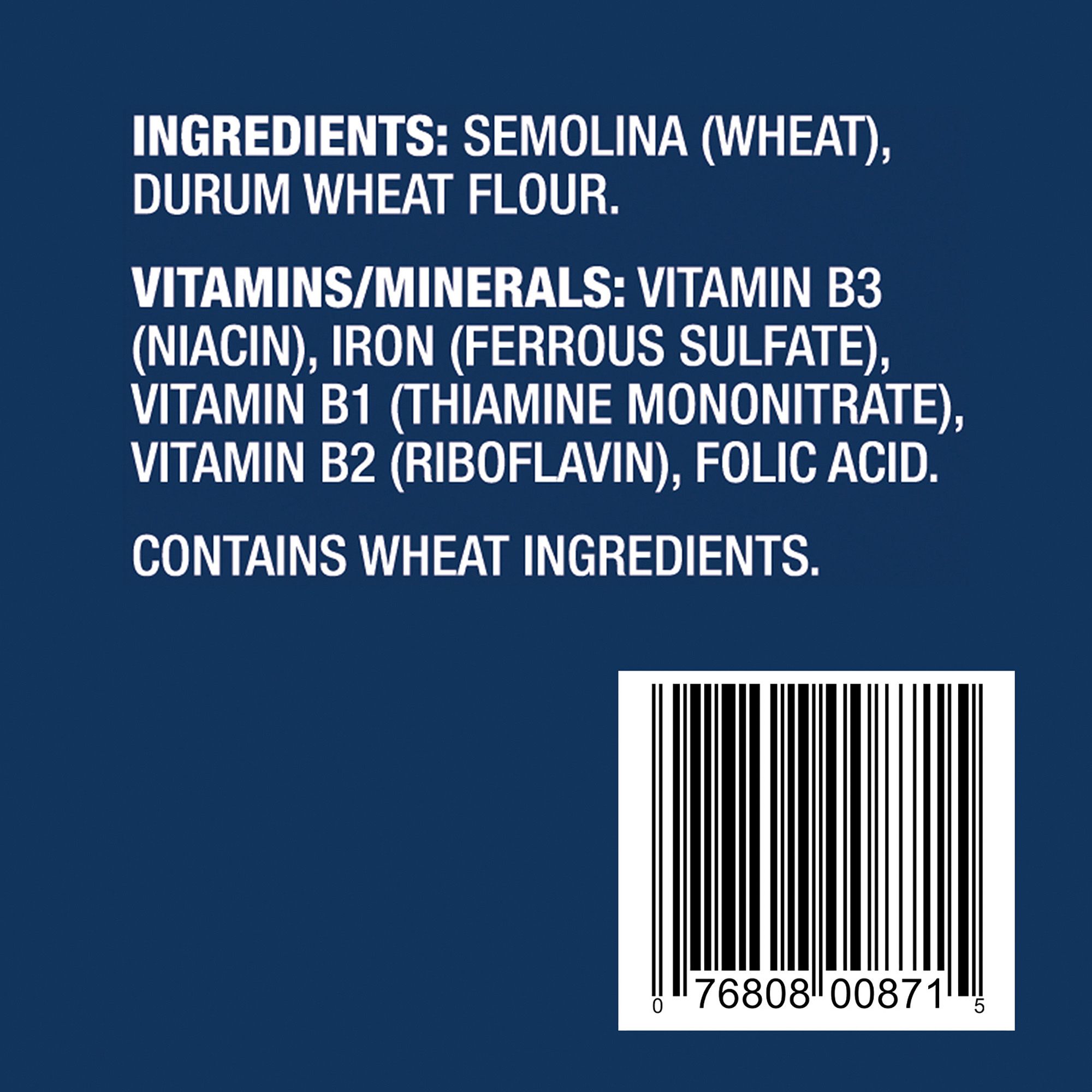 Ingredients: Semolina (Wheat), Durum Wheat Flour, Vitamins/Minerals: Vitamin B3 (Niacin), Iron (Ferrous Sulfate), Vitamin B1 (Thiamine Mononitrate), Vitamin B2 (Riboflavin), Folic Acid.