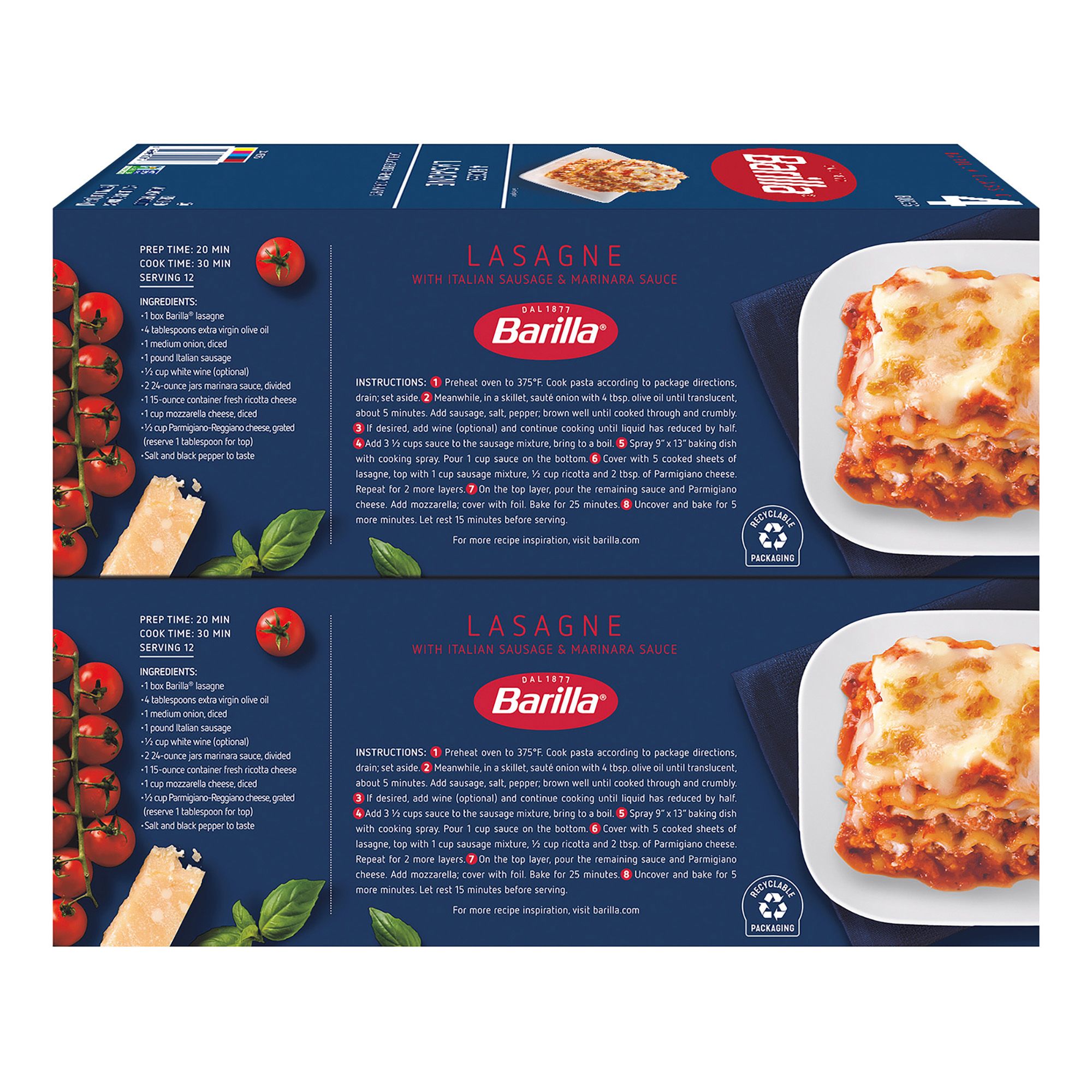 Get inspired with Barilla, a family-owned company making pasta with love and care since 1877. Crafted from high-quality, non-GMO ingredients, this lasagna delivers great taste every time. In particular, each pasta sheet is wide and ridged to hold all your favorite lasagna ingredients. Wavy lasagne pairs well with meat-based sauces like traditional Bolognese, dairy-based sauces like a classic bechamel, and vegetable-based sauces.
