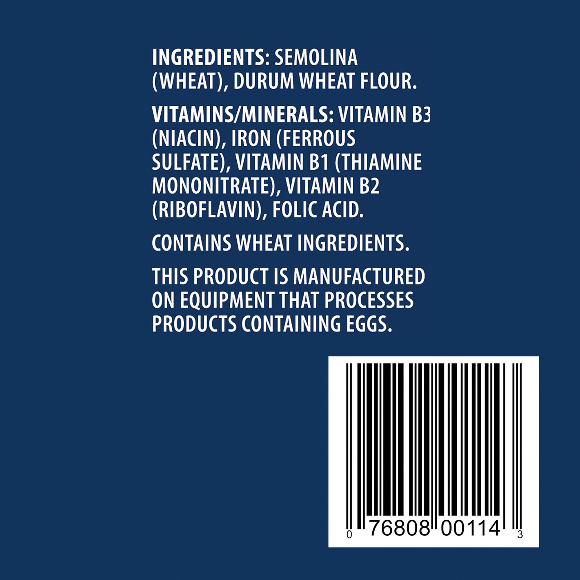 Ingredients:Semolina (Wheat), Durum Wheat Flour, Vitamins/Minerals: Vitamin B3 (Niacin), Iron (Ferrous Sulfate), Vitamin B1 (Thiamine Mononitrate), Vitamin B2 (Riboflavin), Folic Acid.