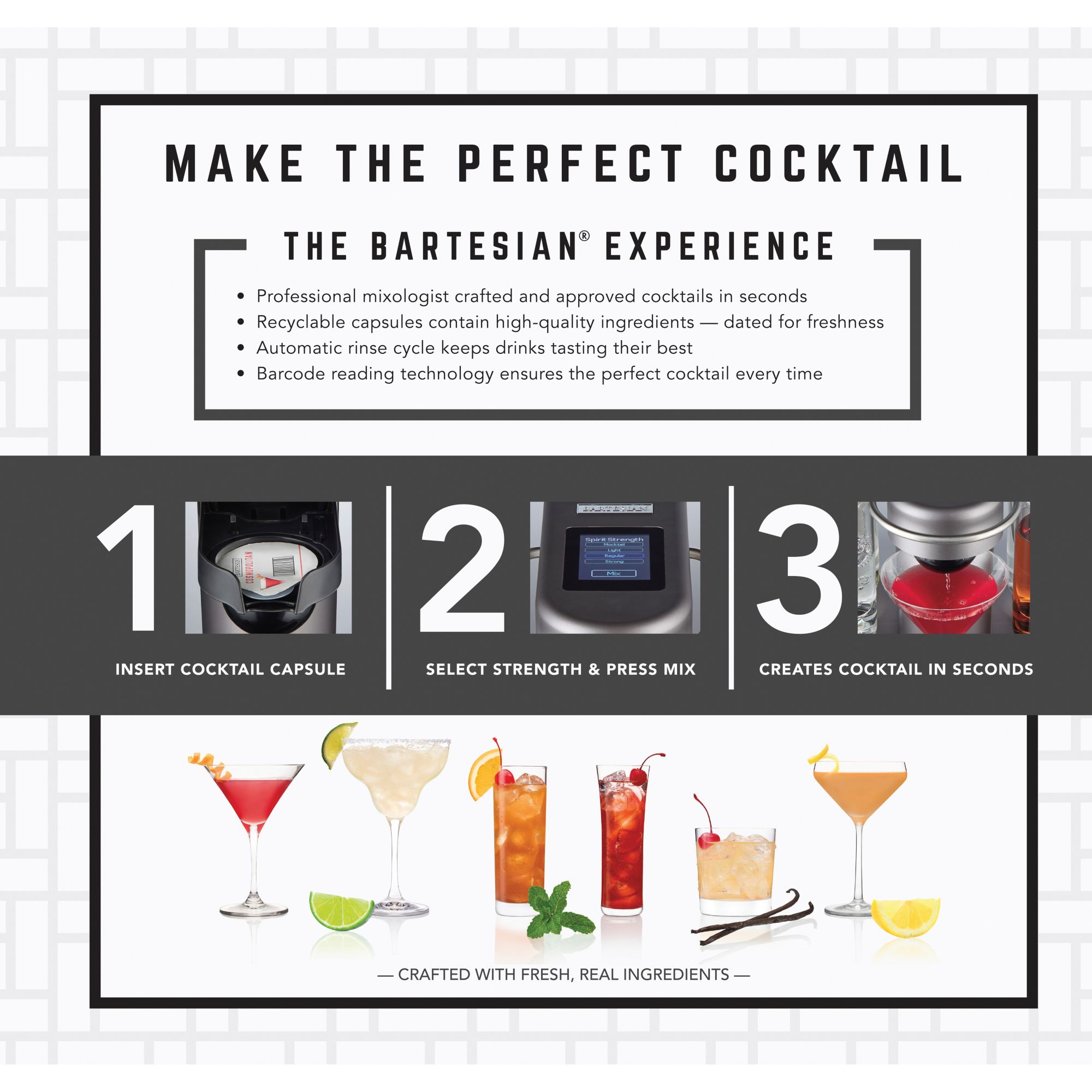 With the Bartesian cocktail maker, you can experience the quality ingredients and premium pours you'd expect from a cocktail lounge in your own home – all at the touch of a button. Fill the Bartesian cocktail maker with your favorite brands of Vodka, Tequila, Whiskey, Gin or Rum, as well as water. Then, insert your desired Bartesian capsules, which contain all the premium bitters, extracts, juice concentrates, and mixers that would otherwise need to be individually sourced, purchased, and stored. Once the Bartesian capsule is inserted into your Bartesian cocktail machine, the cocktail is immediately identified via barcode and suggests the proper glassware on the user interface touchscreen. The Bartesian cocktail machine lets you customize the pour strength of the drink ranging from mocktail to strong, then simply press 'Mix’. Now you can be an at-home mixologist with the Bartesian cocktail maker.