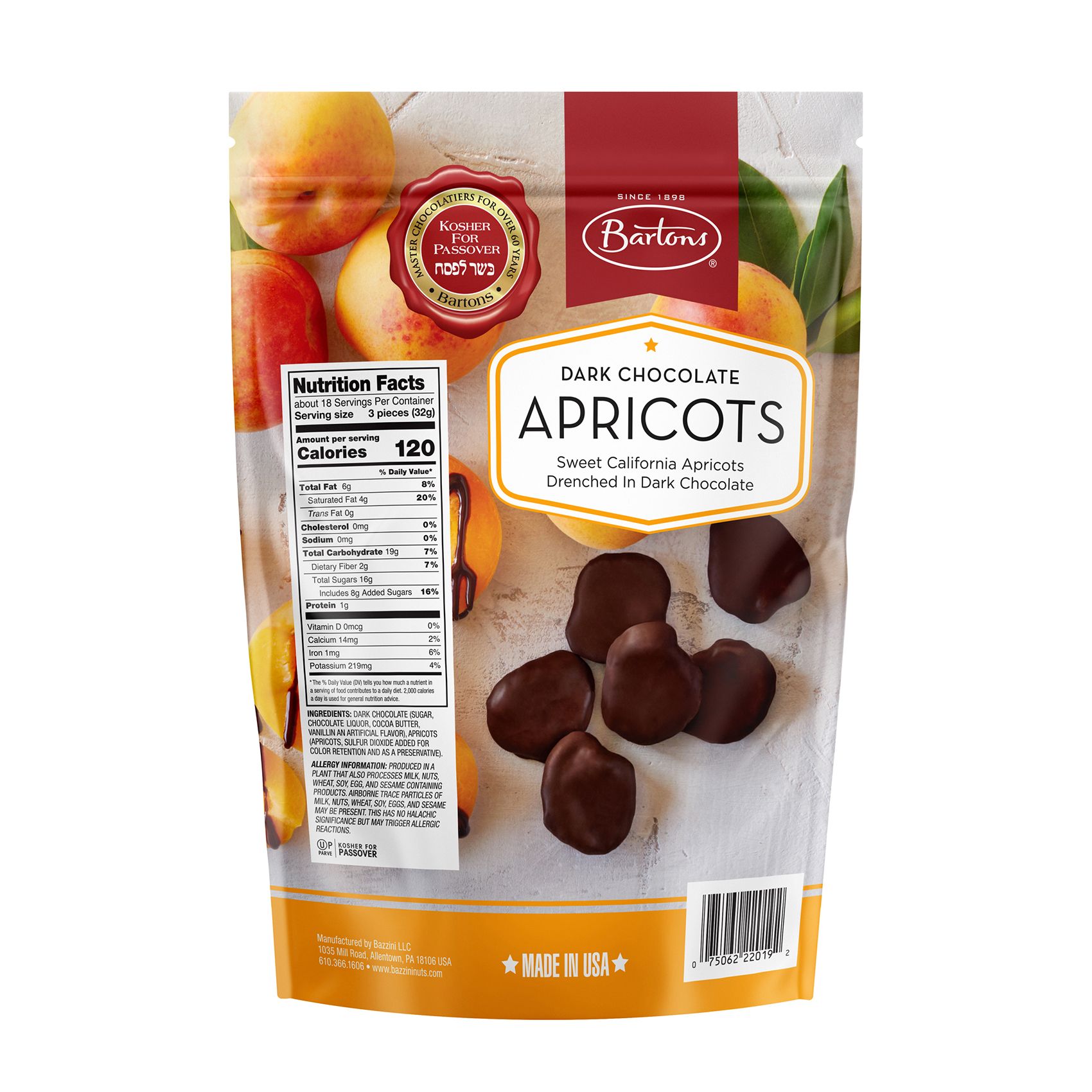 Made with rich dark chocolate for a decadent flavor. Sweet and juicy apricots for a delicious fruit-chocolate combination. From the well-known Barton's chocolate brand. Contains 20 ounces of chocolate apricots for sharing perfect for gifting or sharing. This will make a great treat for Kosher for Passover.