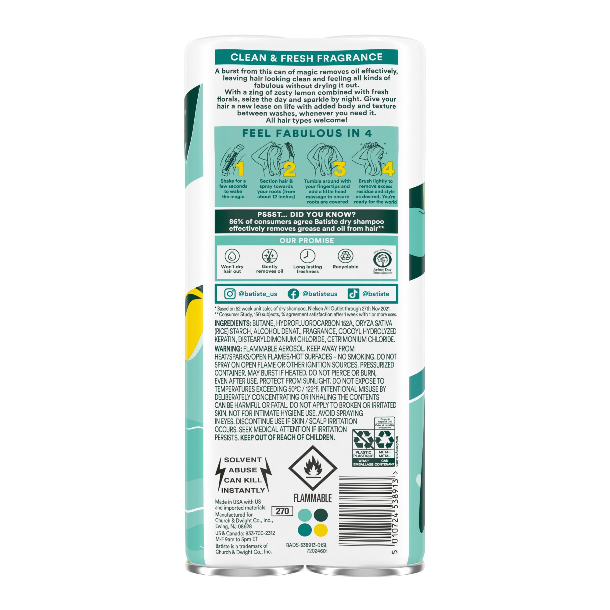 Take your hair from flat to fab with Batiste Dry Shampoo. The waterless formula targets excess oil and grease at the roots. Just spray in, massage, style, and go. Batiste Dry Shampoo instantly makes your hair feel clean, fresh, with added body and texture. Perfect for the girl-on-the-go, use Batiste Dry Shampoo between washes to keep your hair looking fresh and fabulous without the effort. Let's face it, life gets crazy sometimes and skipping a wash (or two) is inevitable. With Batiste Dry Shampoo, you can be confident your hair looks great no matter what life throws your way.