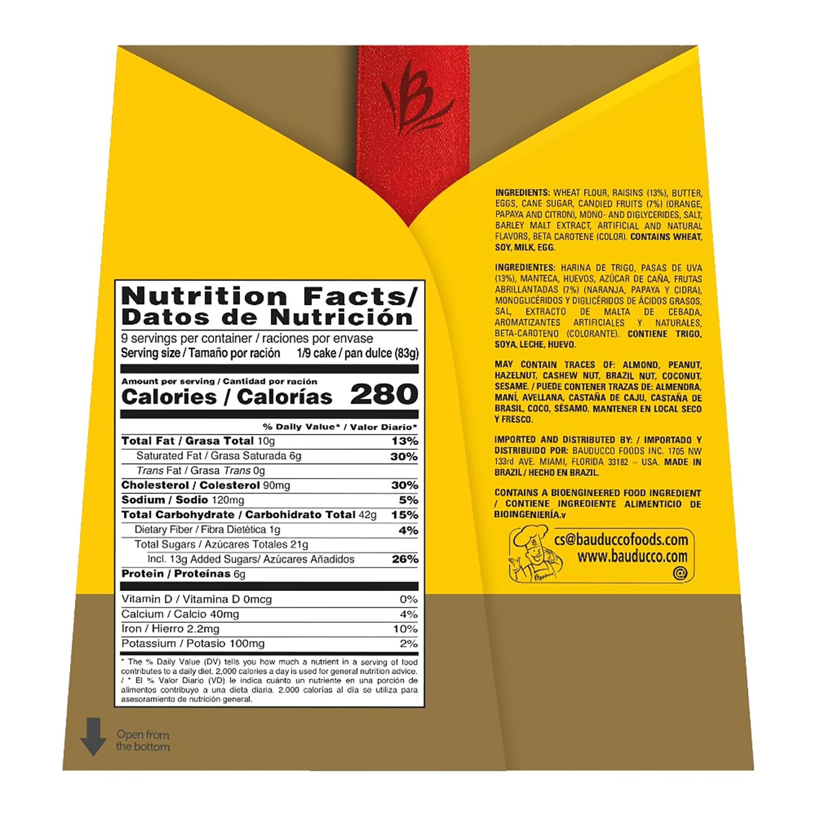 Ingredients: Wheat Flour, Raisins (13%), Butter, Eggs, Cane Sugar, Candied Fruits (7%) (Orange, Papaya And Citron), Mono- And Diglycerides, Salt, Barley Malt Extract, Artificial And Natural Flavors, Beta Carotene (Color). Contains Wheat, Soy, Milk, Egg.