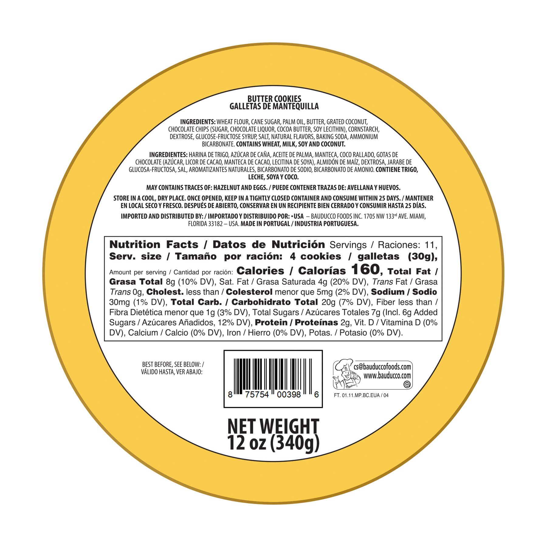 Ingredients: Wheat Flour, Sugar, Palm Oil, Butter (Cream), Grated Coconut, Chocolate Chips (Sugar, Cocoa Paste, Cocoa Butter And Soy Lecithin), Corn Starch, Dextrose, Glucose-fructose Syrup, Salt, Natural Flavors, Baking Soda, Ammonium Bicarbonate. Contains Wheat, Milk, Soy And Coconut.