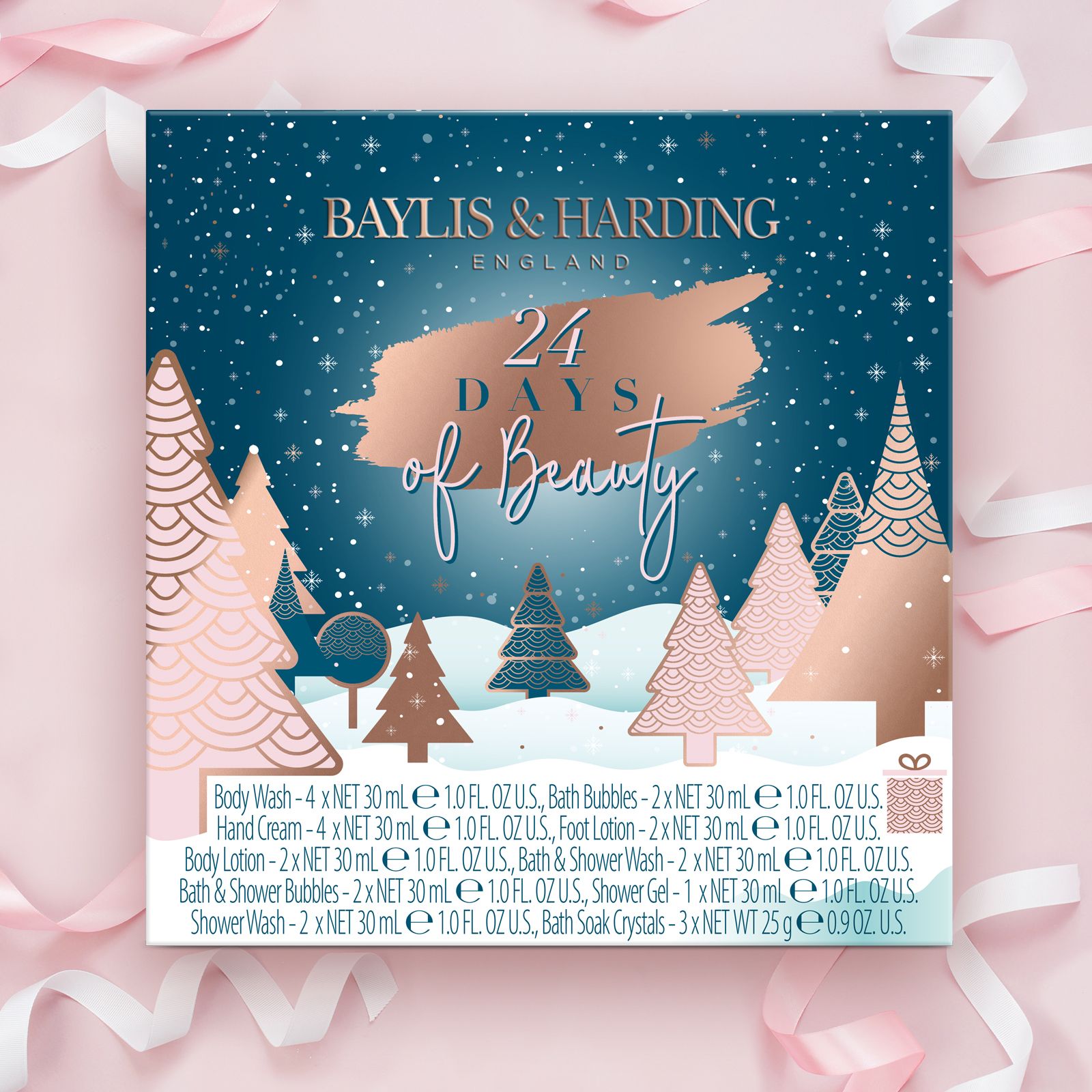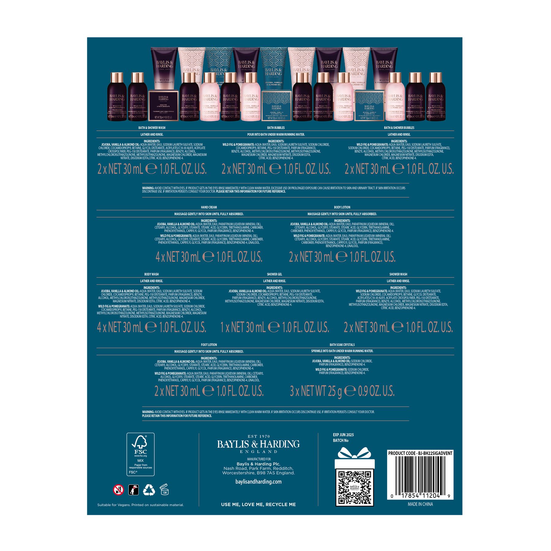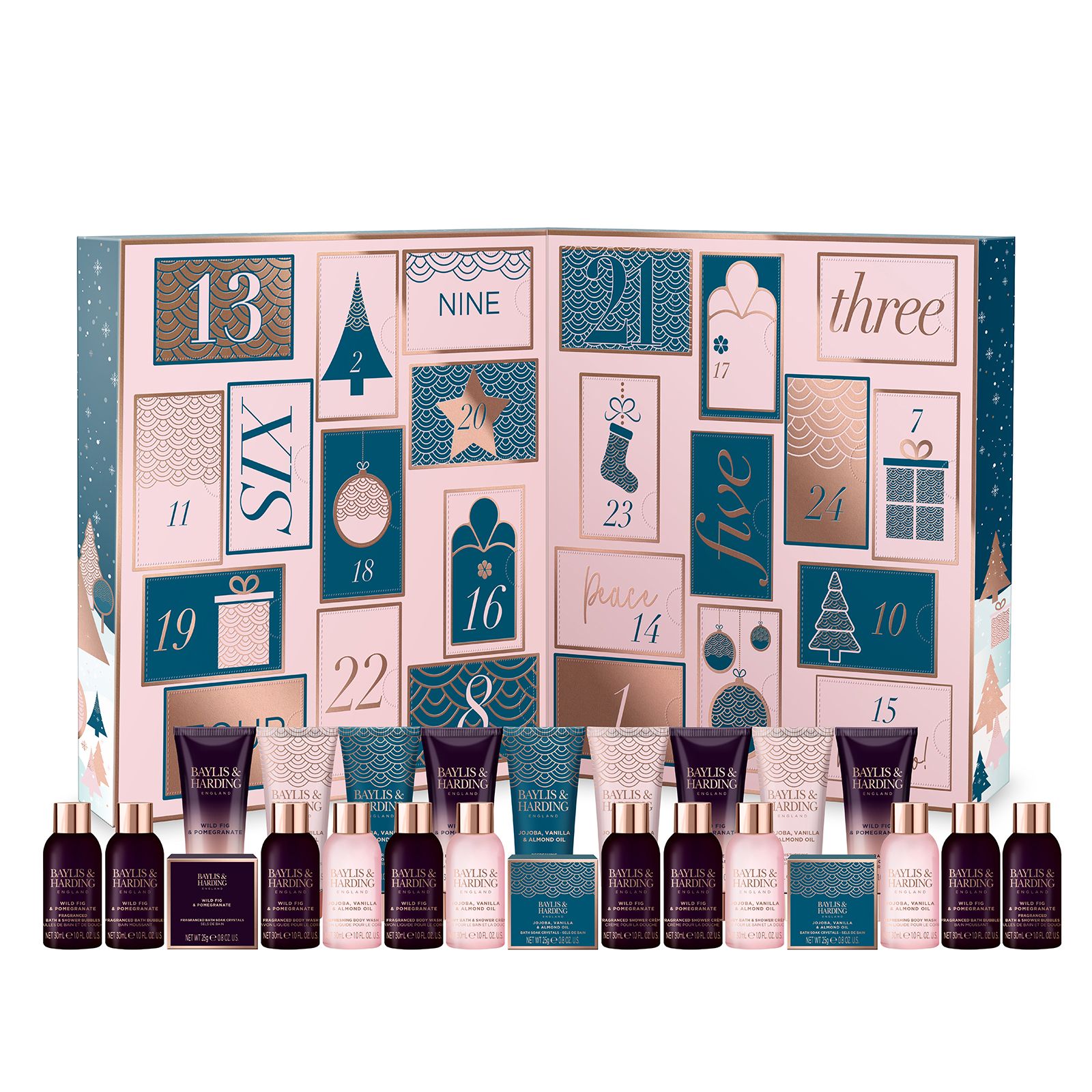 2 x 30mL body wash, 2 x 30mL bath & shower, 2 x 30mL hand cream, 30mL foot lotion, 30mL body lotion, 30mL shower gel, 2 x 25g bath soak crystals. Wild Fig & Pomegranate Fragranced 2 x 30mL body wash, 2 x 30mL bath bubbles, 2 x shower crème, 30mL bath & shower bubbles, 2 x 30mL hand cream, 30mL body lotion, 30mL foot lotion, 25g bath soak crystals The perfect festive gift. Get excited for Christmas with this wonderful Baylis & Harding 2022 advent calendar Treat someone or yourself to 24 daily treats with every pamper essential you could wish for Take time for your daily self-care treats in this much loved Jojoba, Vanilla & Almond oil and Wild Fig & Pomegranate scents Not tested on animals or contains animal-derived materials. Suitable for vegans Plastic free outer packaging - 100% recyclable