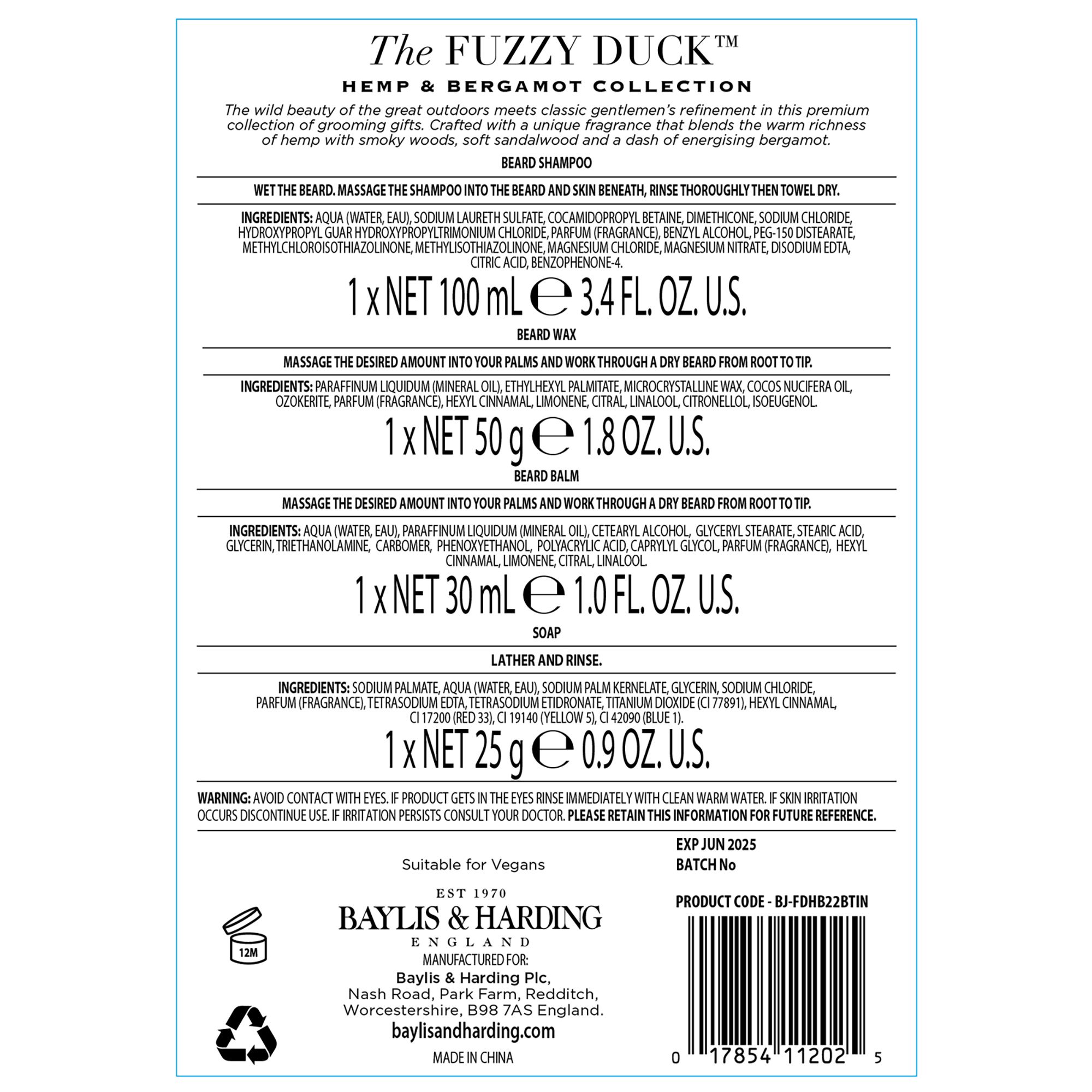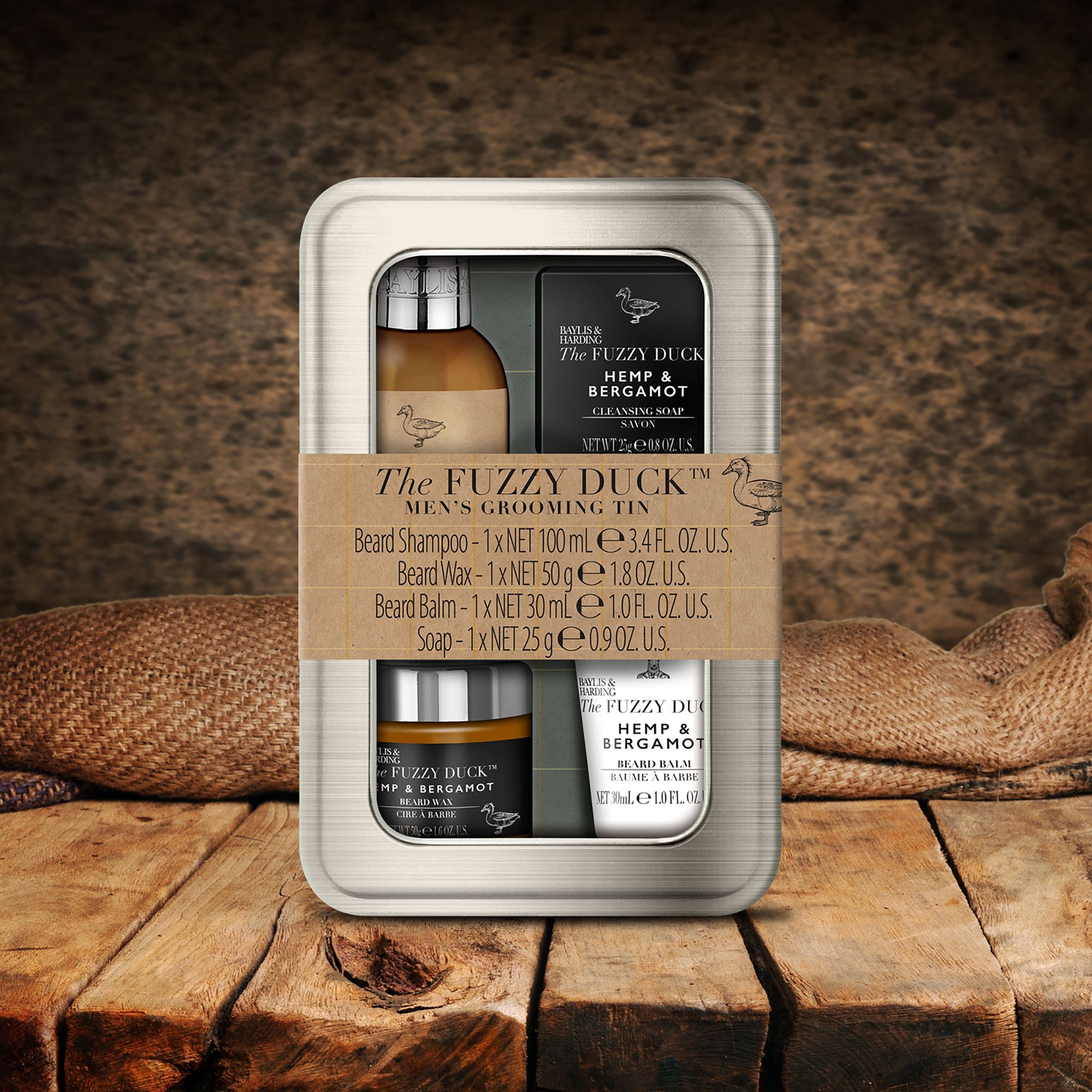 Baylis & Harding The Fuzzy Duck Men's Hemp & Bergamot Beard Tin, Containing: 100mL beard shampoo, 50g beard wax, 30mL beard balm, 25g soap, and storage tin Presented in a reusable storage tin Rich and energising Hemp & Bergamot fragrance Suitable for vegans, Not tested on animals Reusable tin ideal for storage and reuse