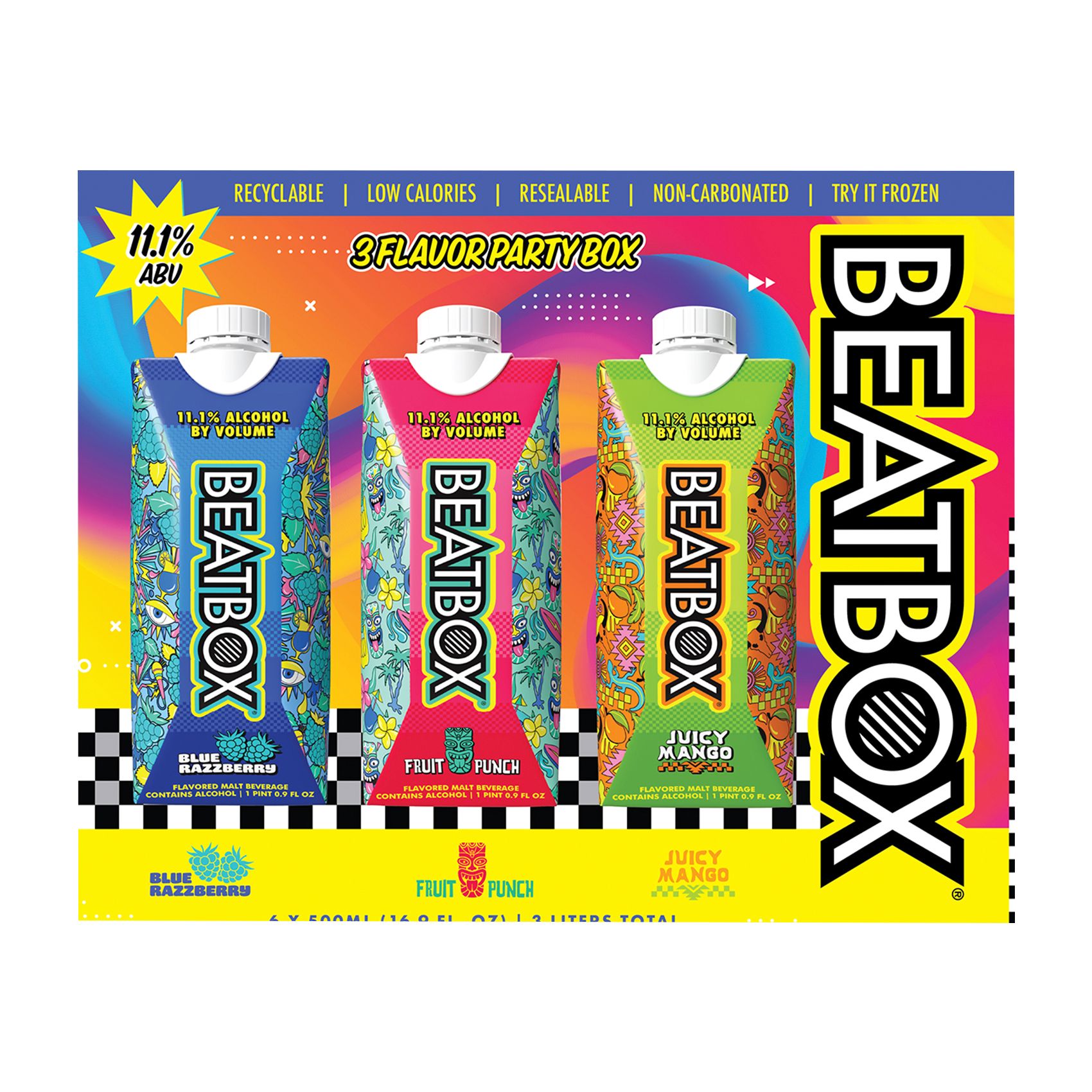 BeatBox is the original Party Punch! BeatBox Variety Pack offers you three of our top flavors, Fruit Punch, Blue Razzberry and Green Apple! Whatever your variety, there's a flavor for everyone! You will receive three of each flavor in our Variety Pack. Beatbox is 11% ABV in a resealable tetra package. BeatBox is non-carbonated and offers 3 servings per tetra. BeatBox is best served chilled or over ice and can even be served frozen as a ready to drink slushie! BeatBox is in eco-friendly packaging. An RTD stands for Ready-To-Drink. It refers to pre-mixed beverages that are packaged and ready for immediate consumption — no mixing or additional ingredients needed. In the alcohol world, RTDs are growing fast because they’re fun, flavorful, and low-effort — grab and go, basically.