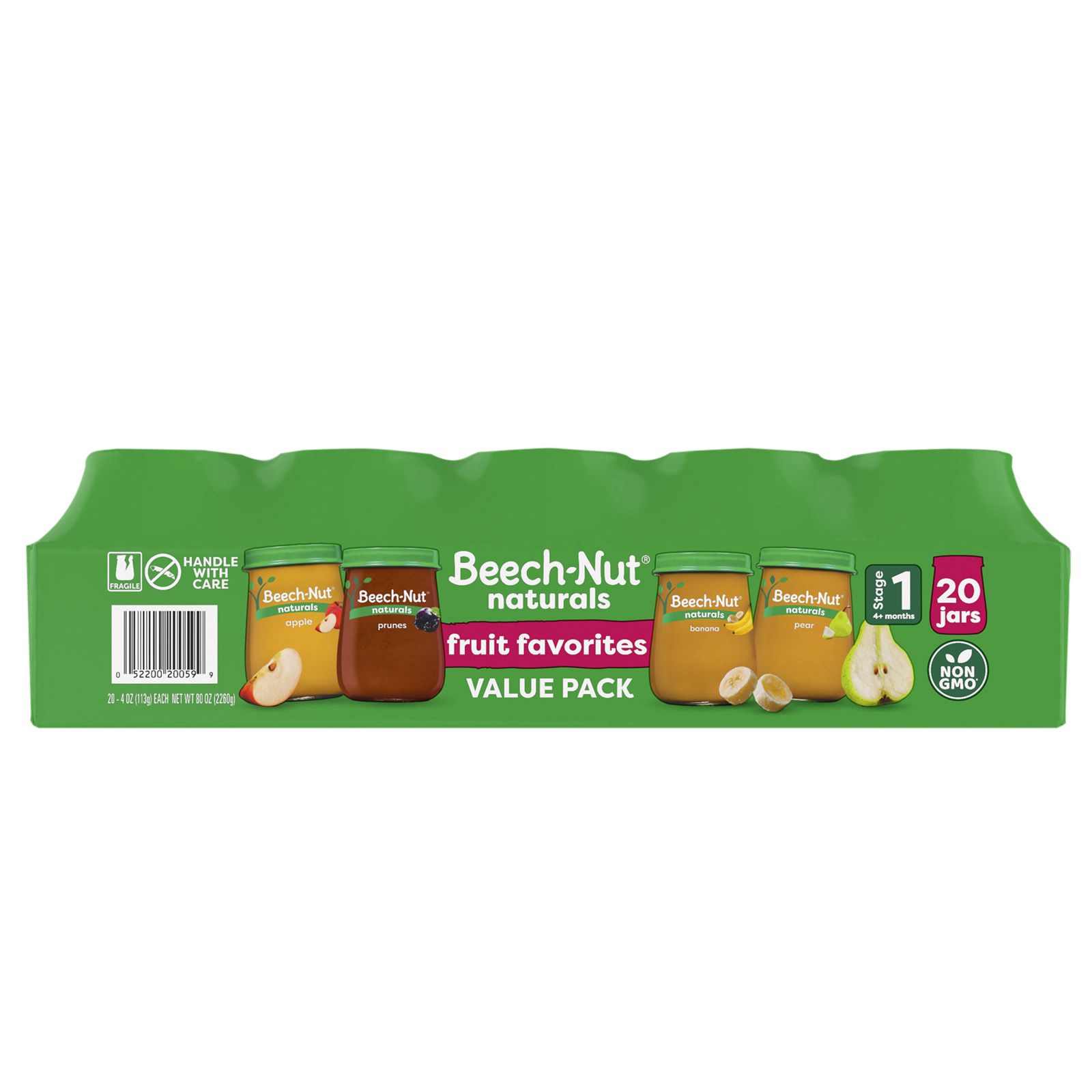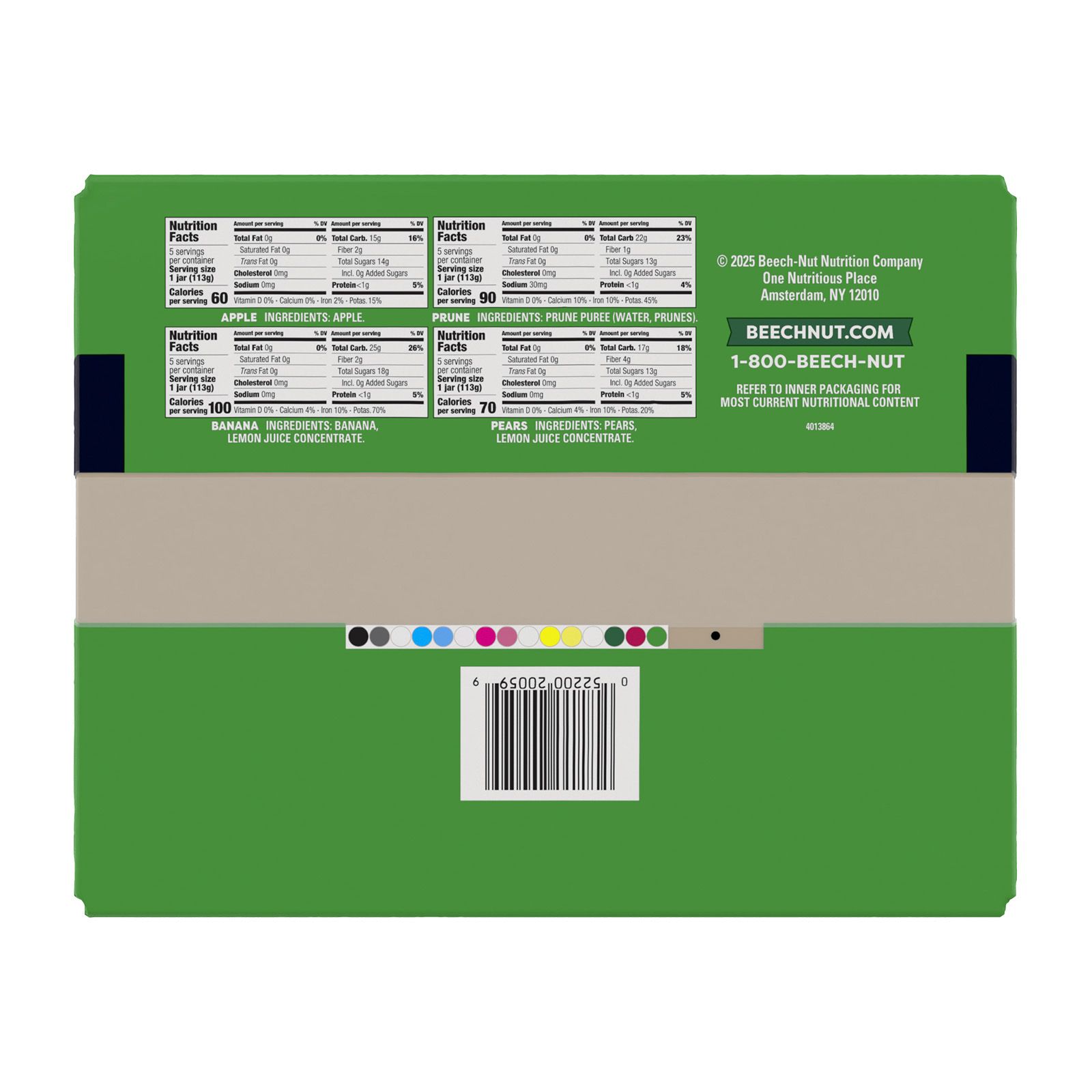 Beech-Nut Naturals Baby Food is made with simple, non-GMO ingredients. This fruit variety pack includes (5) apple, (5) pear, (5) banana & (5) prune jars. Beech-Nut baby food purees have no artificial preservatives, colors or flavors and no added sweeteners--just what you'd expect for baby's first foods. Fruits are gently cooked to preserve color, flavor, and nutrients to create a puree that's perfect for introducing solids. Free of the following allergens: dairy, gluten, peanut, soy, egg. This Stage 1 baby food is ideal for babies 4 months and up.