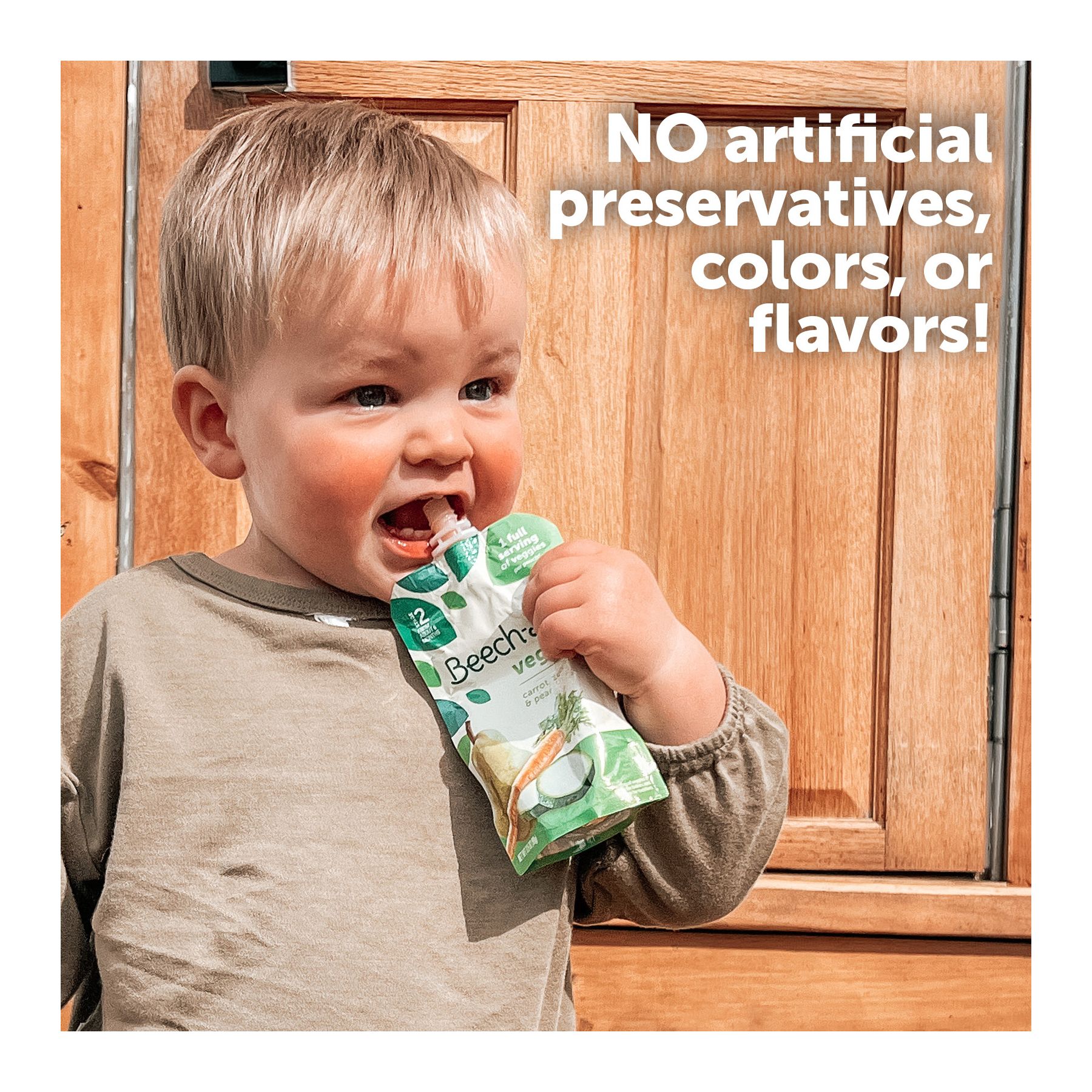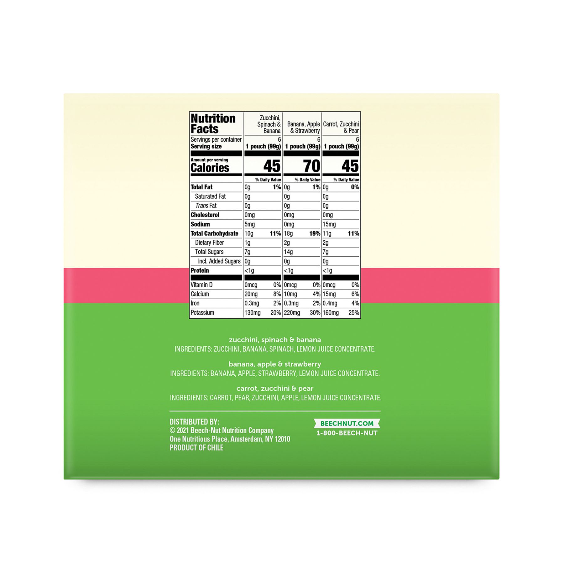 Delicious blends of nutritious fruits and veggies No artificial preservatives, colors or flavors and no added sweeteners Non-GMO (made with ingredients that are not genetically modified) Stage 2 for babies six months and up Includes (18) pouches, 3.5 oz. (6 carrot, zucchini & pear, 6 zucchini, spinach & banana, 6 banana, apple & strawberry)