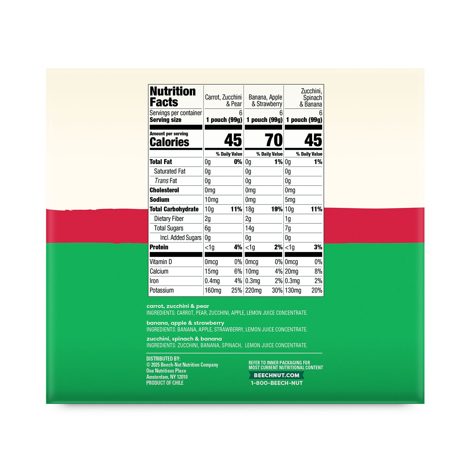 Beech-Nut Baby and Toddler Food Pouches are made with real ingredients and packed in convenient pouches for on-the-go feeding. This variety pack contains (6) carrot, zucchini & pear, (6) zucchini, spinach & banana, and (6) banana, apple & strawberry pouch purees. These baby food pouches are a delicious way to squeeze more fruits and veggies into your little one's day. This Stage 2 puree is ideal for your baby six months and up.